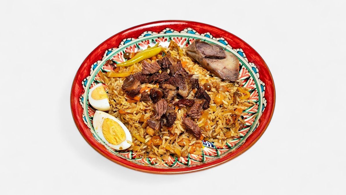 Сытный плов с говядиной, из риса твердого сорта лазер. Готовится с желтой морковью, нутом и изюмом