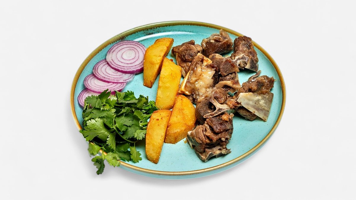Представляет собой кусочки нежной, обжаренной баранины с румяной корочкой, приправленной специями, ароматным картофелем