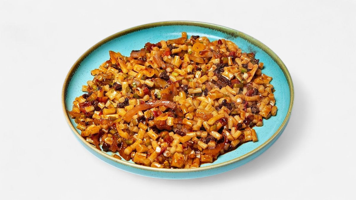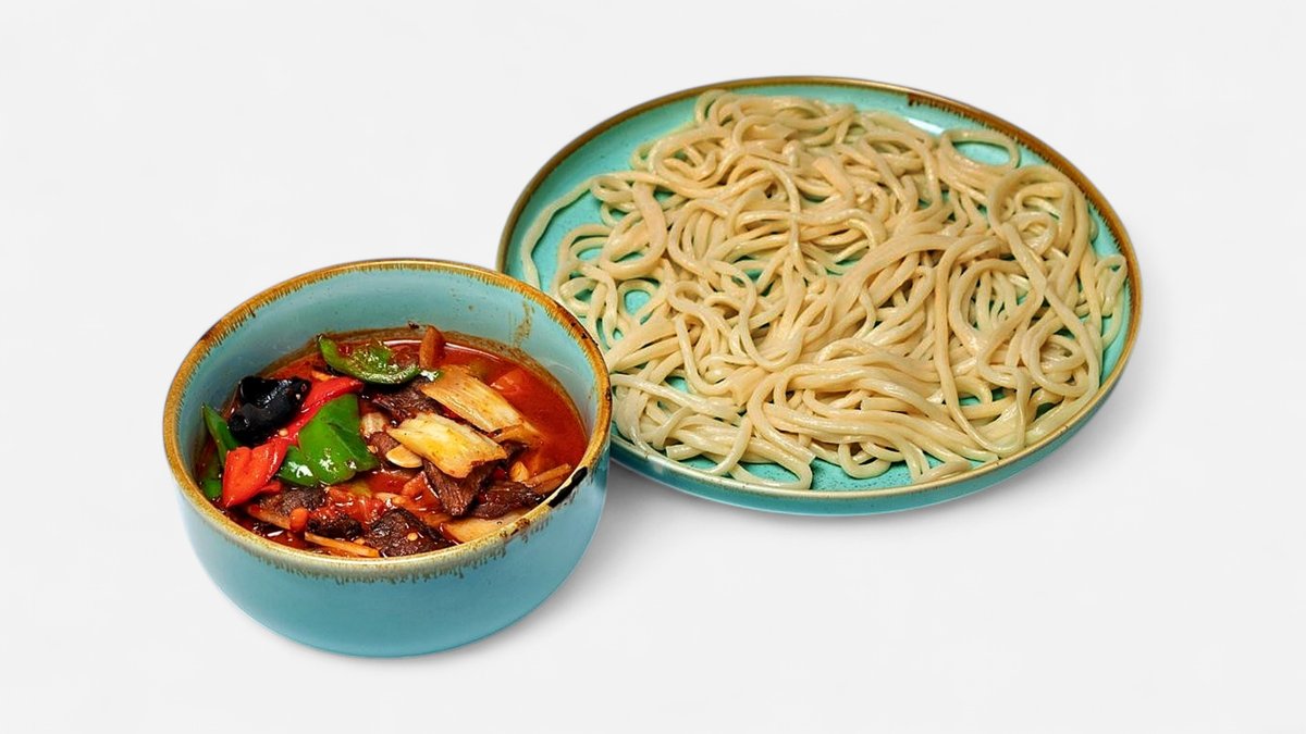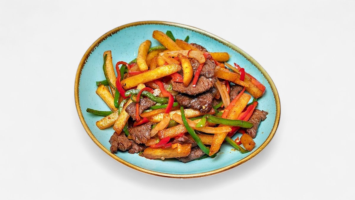 Обжаренная лапша с нарезанным мясом и овощами. Отличается равномерной нарезкой и сбалансированным вкусом с щепоткой остроты