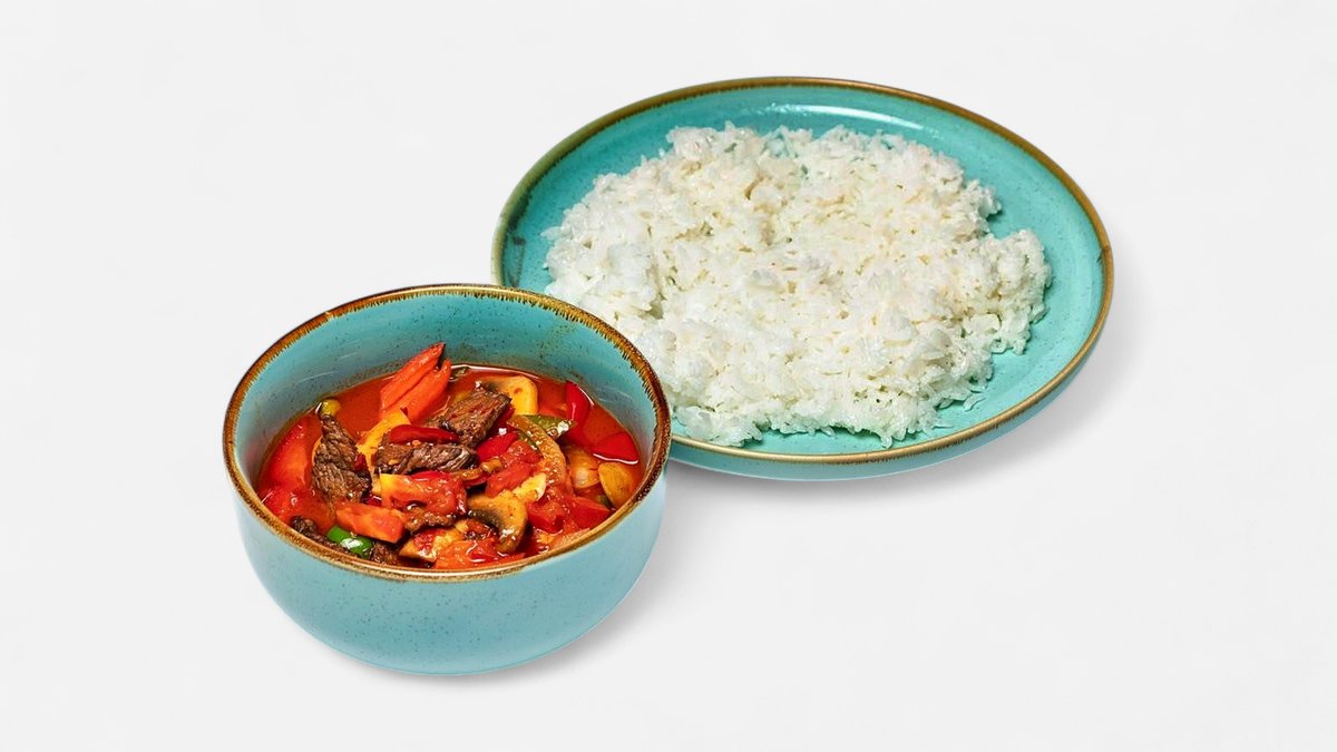 Свежесваренный рис собственного приготовления с сочным мясом и ароматными овощами. Блюдо средней остроты