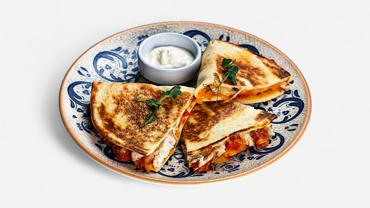Лепешка пита, начиненная курочкой, жареными овощами и сыром