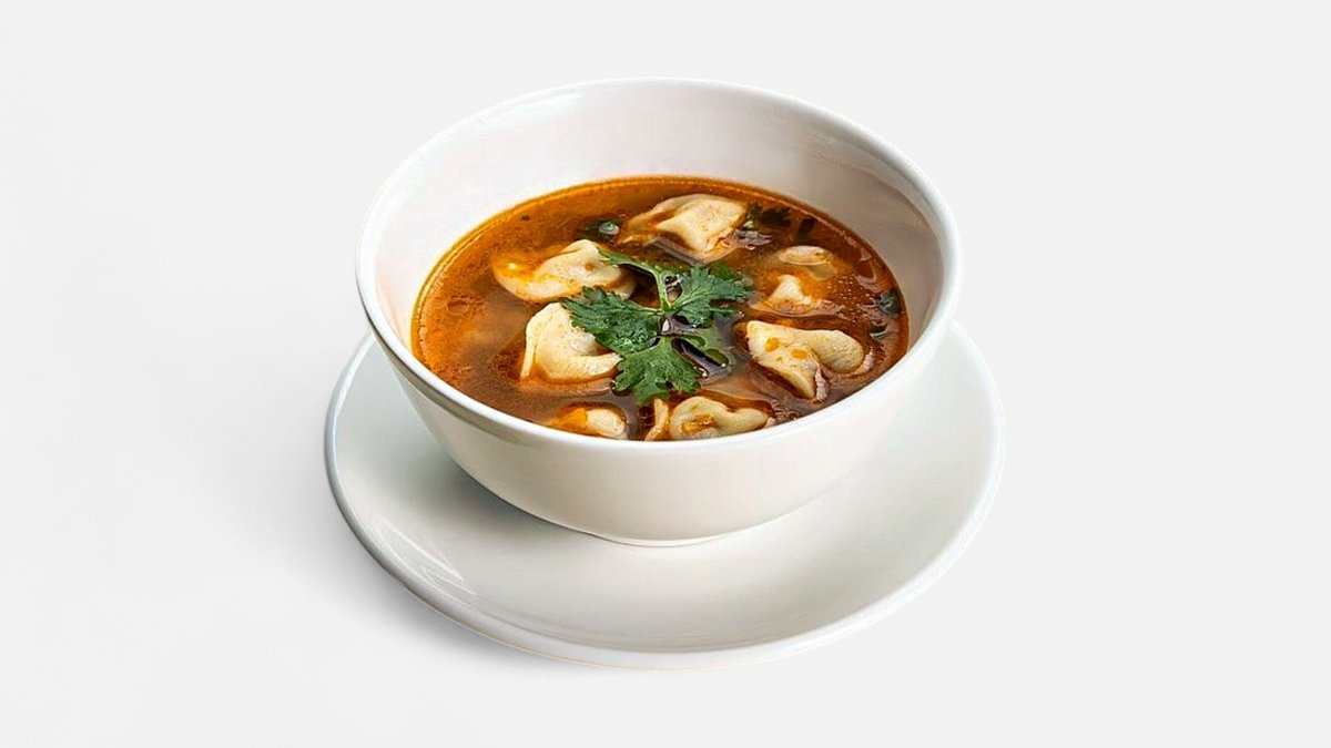 Домашние пельмешки в бульоне, с добавлением томата, болгарского перца,лука,моркови и кинзы, с восточными специями.