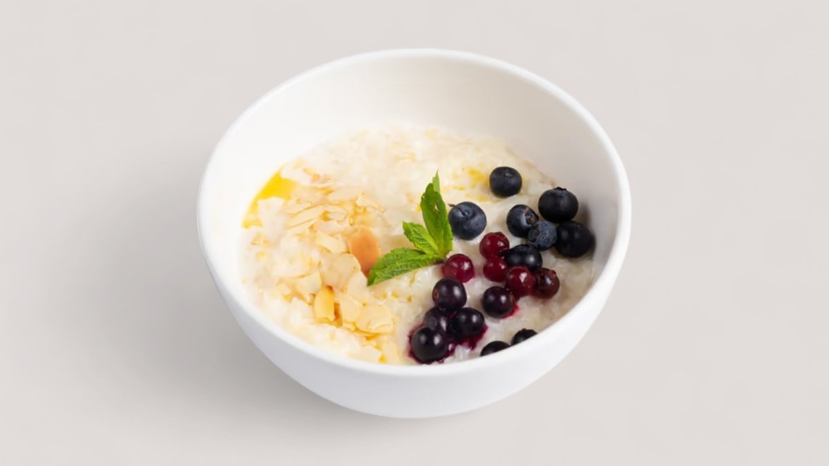 сладкая молочная каша со сливочным маслом и сезонными фруктами и ягодами