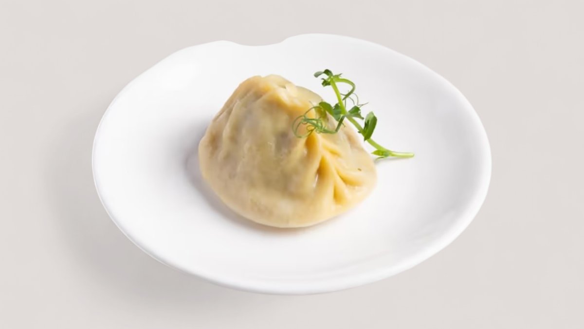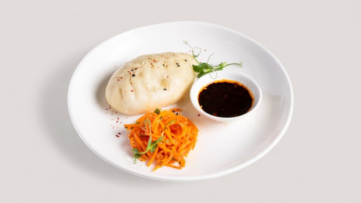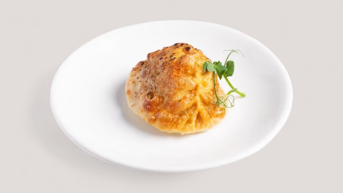 Паровая пампушка с начинкой, обжаренная с капустой и телятиной.