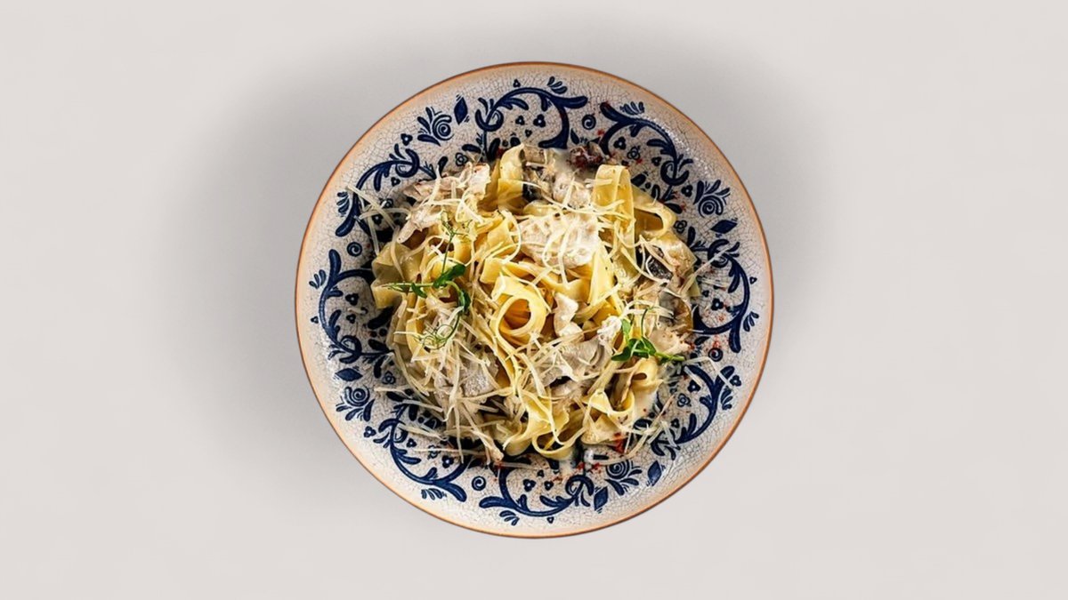 домашняя лапша с кусочками обжаренного куриного филе в сливках, с грибами, посыпана сыром пармезан
