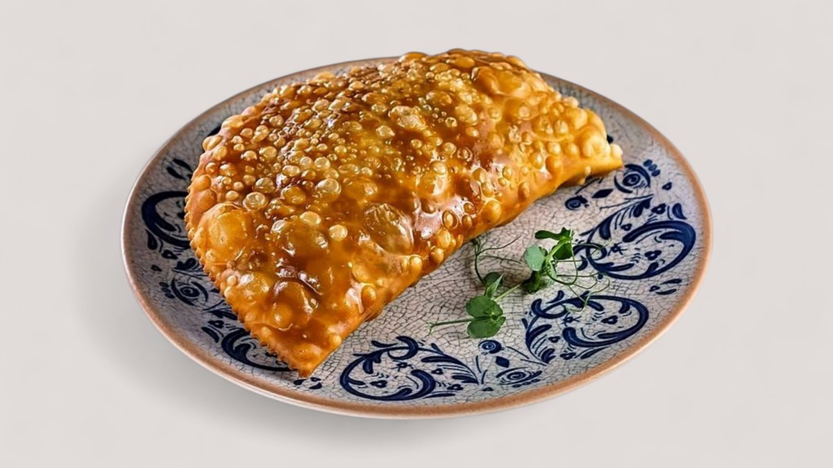 Треугольная форма из теста, начиненная говяжьим фаршем, кинзой и зеленым луком, обжаренная во фритюре. Подается со сметаной