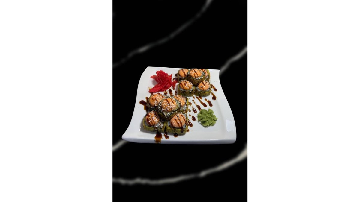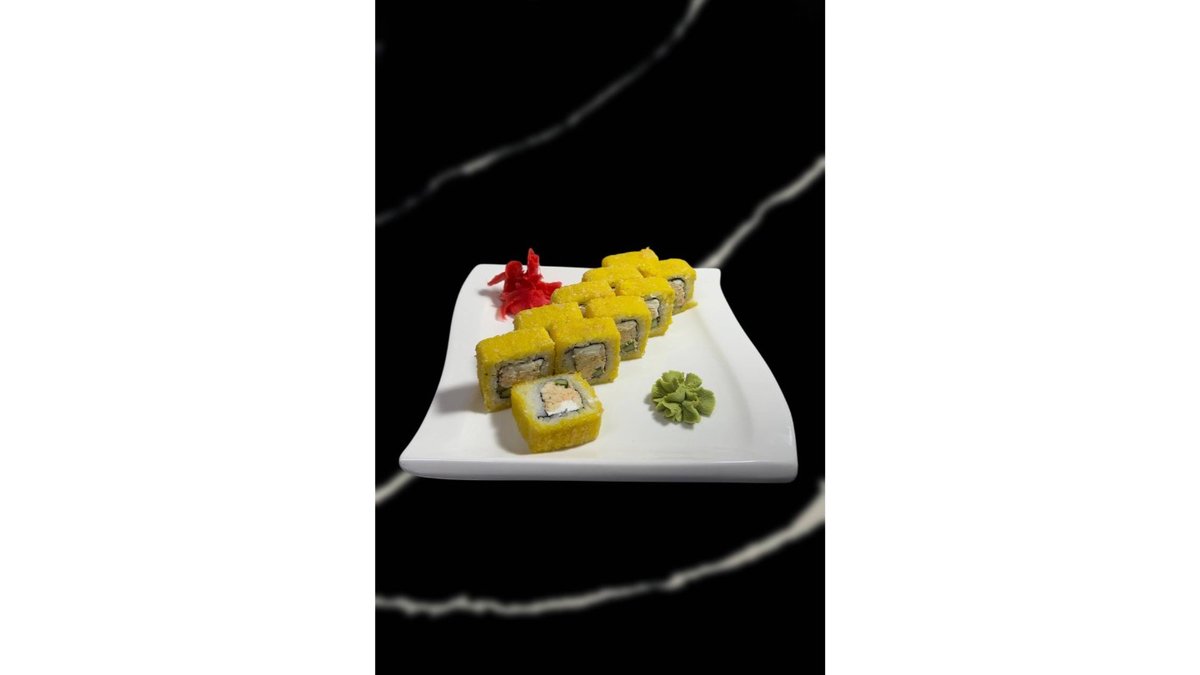 Состав: Суши рис, нори, тобико, сыр креметта, креветки темпура, семга, томаго, авокадо, тобико
