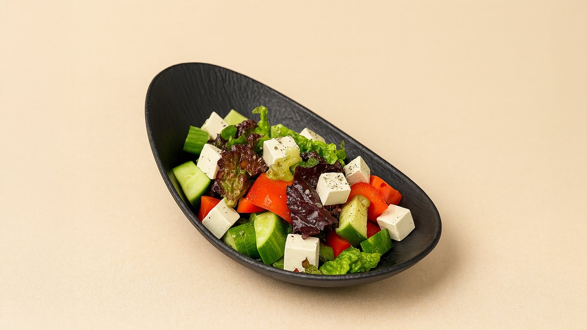 Помидоры, огурцы, болгарский перец, красный лук, маслины без косточек, сыр фета , оливковое масло, сушёный орегано.
