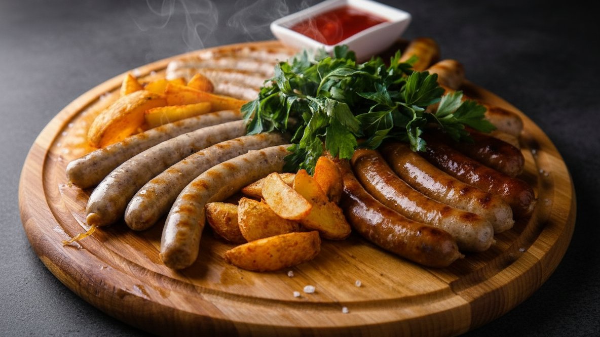 3 вида колбасок (улитки), капуста квашенная, картофельные дольки, горчица