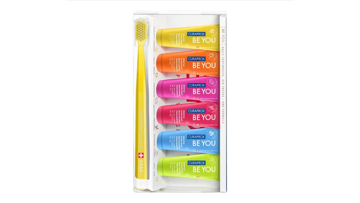 Набор отбеливающих зубных паст Curaprox Be You 6 вкусов + зубная щетка Curaprox 5460 Ultra Soft. Цвет ручки - желтый.