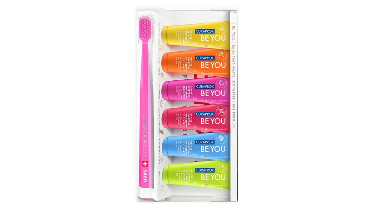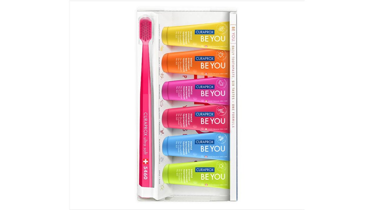 Набор отбеливающих зубных паст Curaprox Be You 6 вкусов + зубная щетка Curaprox 5460 Ultra Soft. Цвет ручки - розовый.