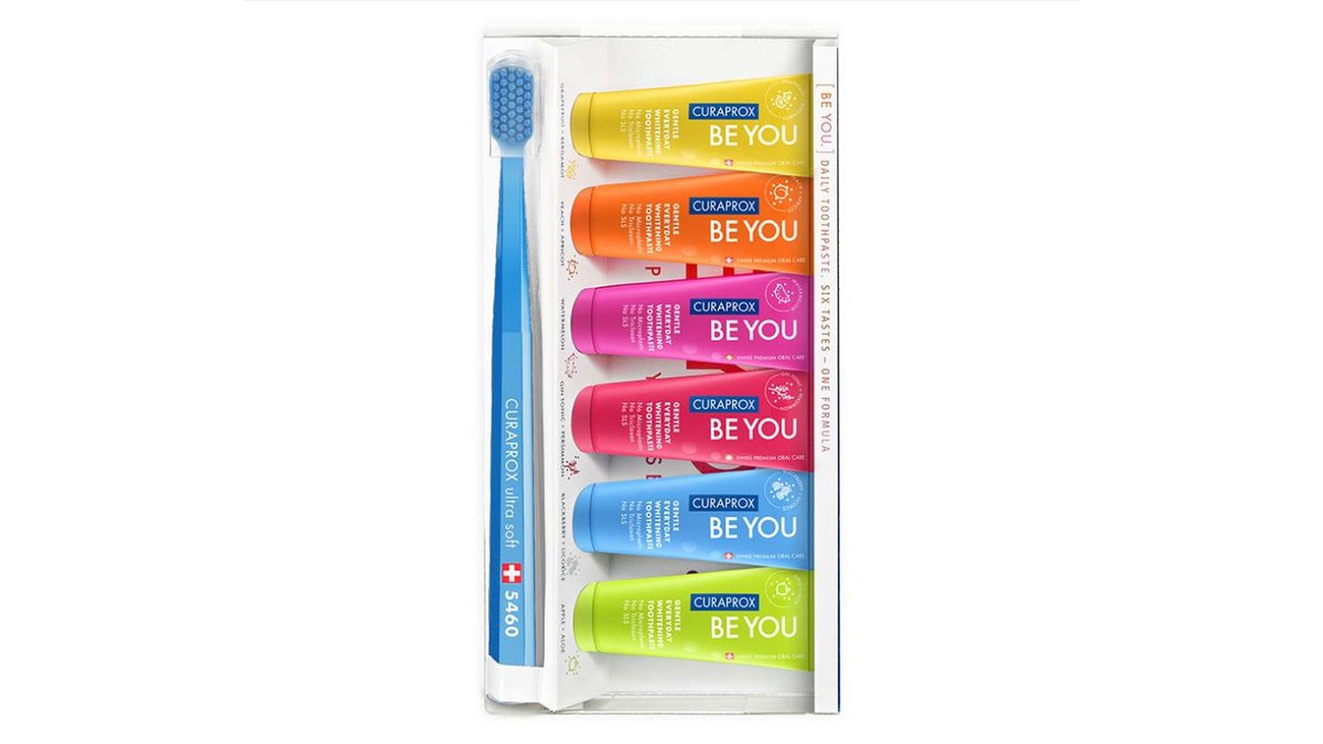 Набор отбеливающих зубных паст Curaprox Be You 6 вкусов + зубная щетка Curaprox 5460 Ultra Soft. Цвет ручки - голубой.
