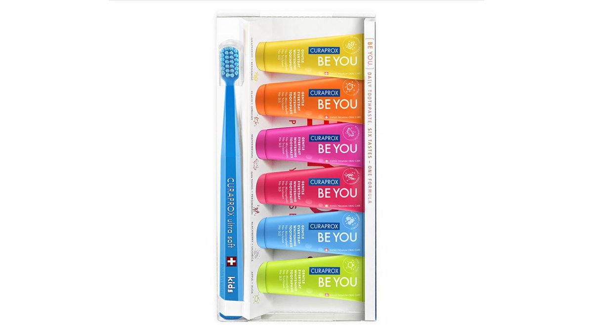 Набор отбеливающих зубных паст Curaprox Be You 6 вкусов + зубная щетка Curaprox Kids 5500 Ultra Soft. Цвет ручки - синий.