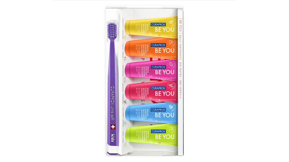 Набор отбеливающих зубных паст Curaprox Be You 6 вкусов + зубная щетка Curaprox Kids 5500 Ultra Soft. Цвет ручки - фиолетовый.