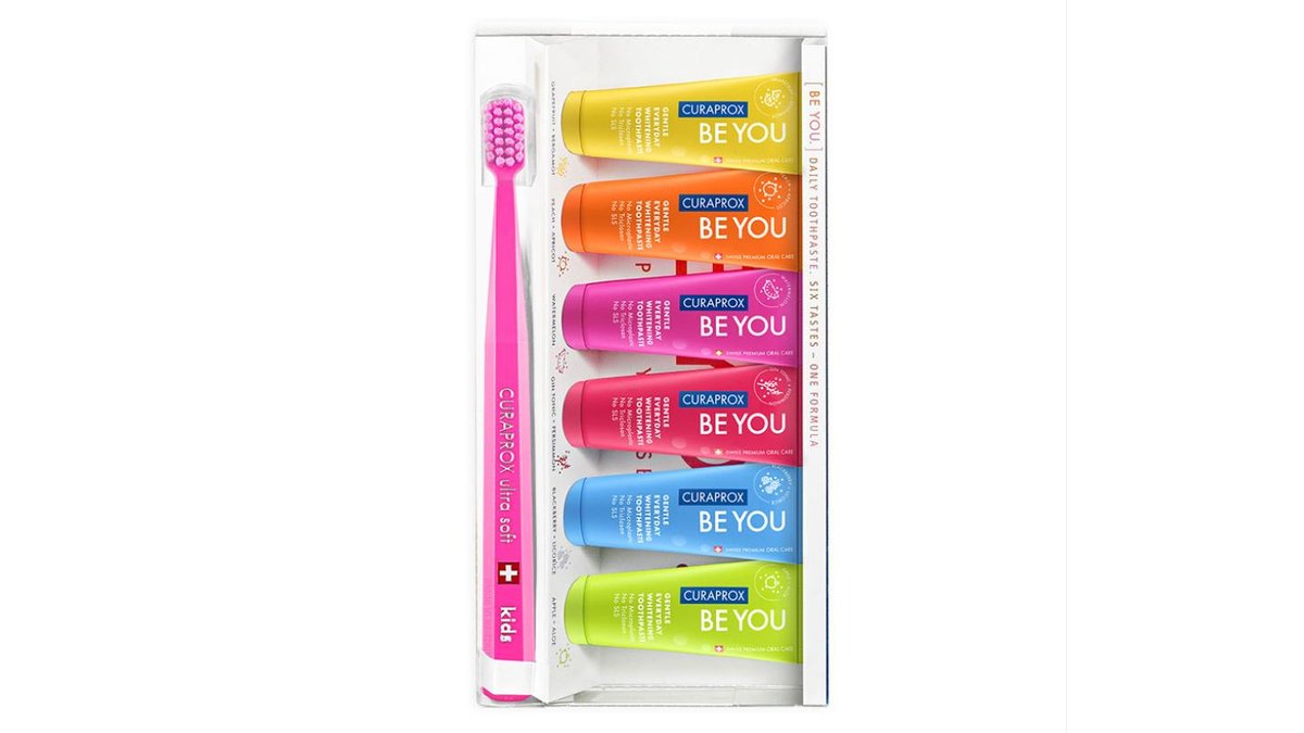 Набор отбеливающих зубных паст Curaprox Be You 6 вкусов + зубная щетка Curaprox Kids 5500 Ultra Soft. Цвет ручки - розовый.