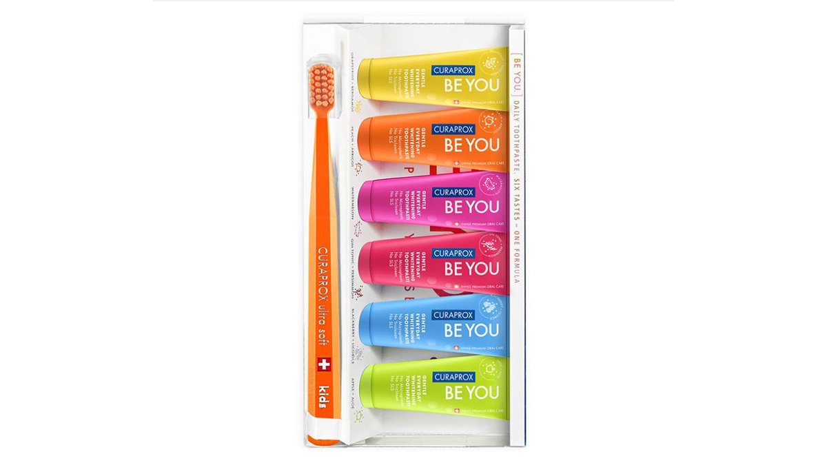 Набор отбеливающих зубных паст Curaprox Be You 6 вкусов + зубная щетка Curaprox Kids 5500 Ultra Soft. Цвет ручки - оранжевый.