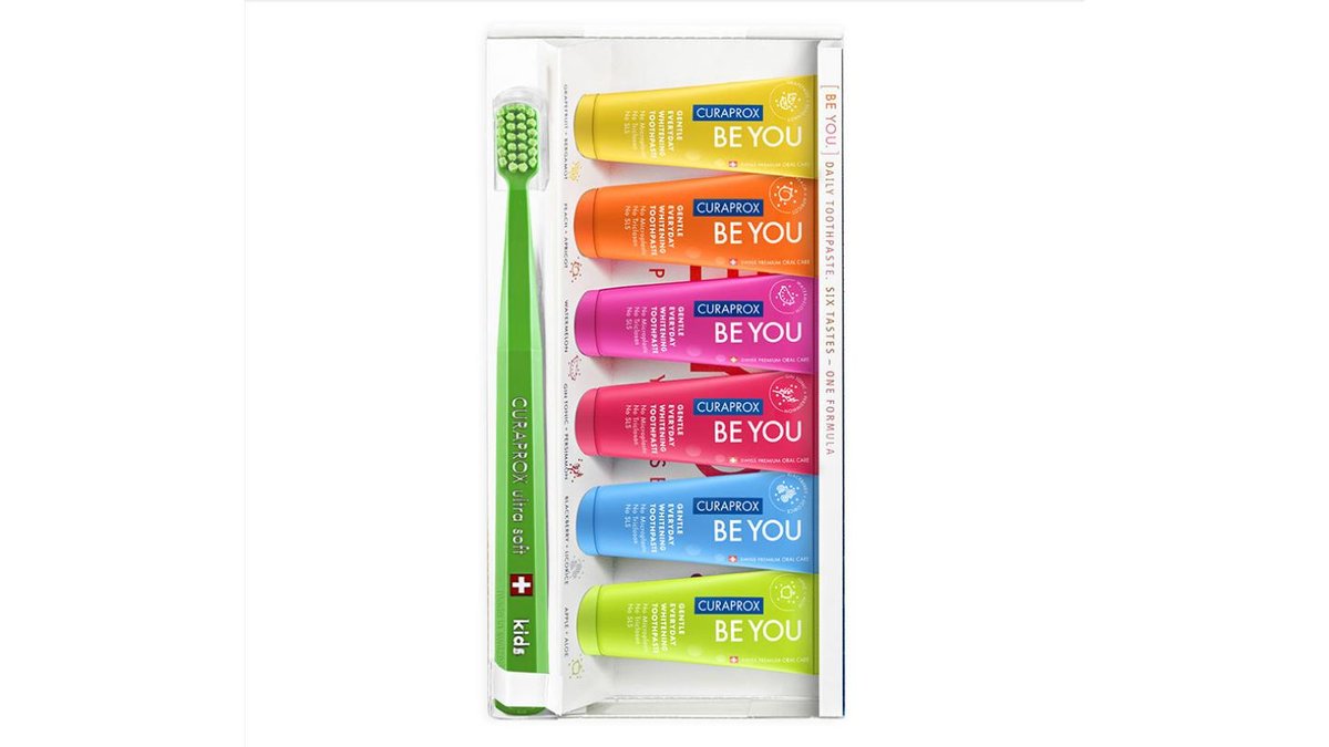 Набор отбеливающих зубных паст Curaprox Be You 6 вкусов + зубная щетка Curaprox Kids 5500 Ultra Soft. Цвет ручки - зеленый.
