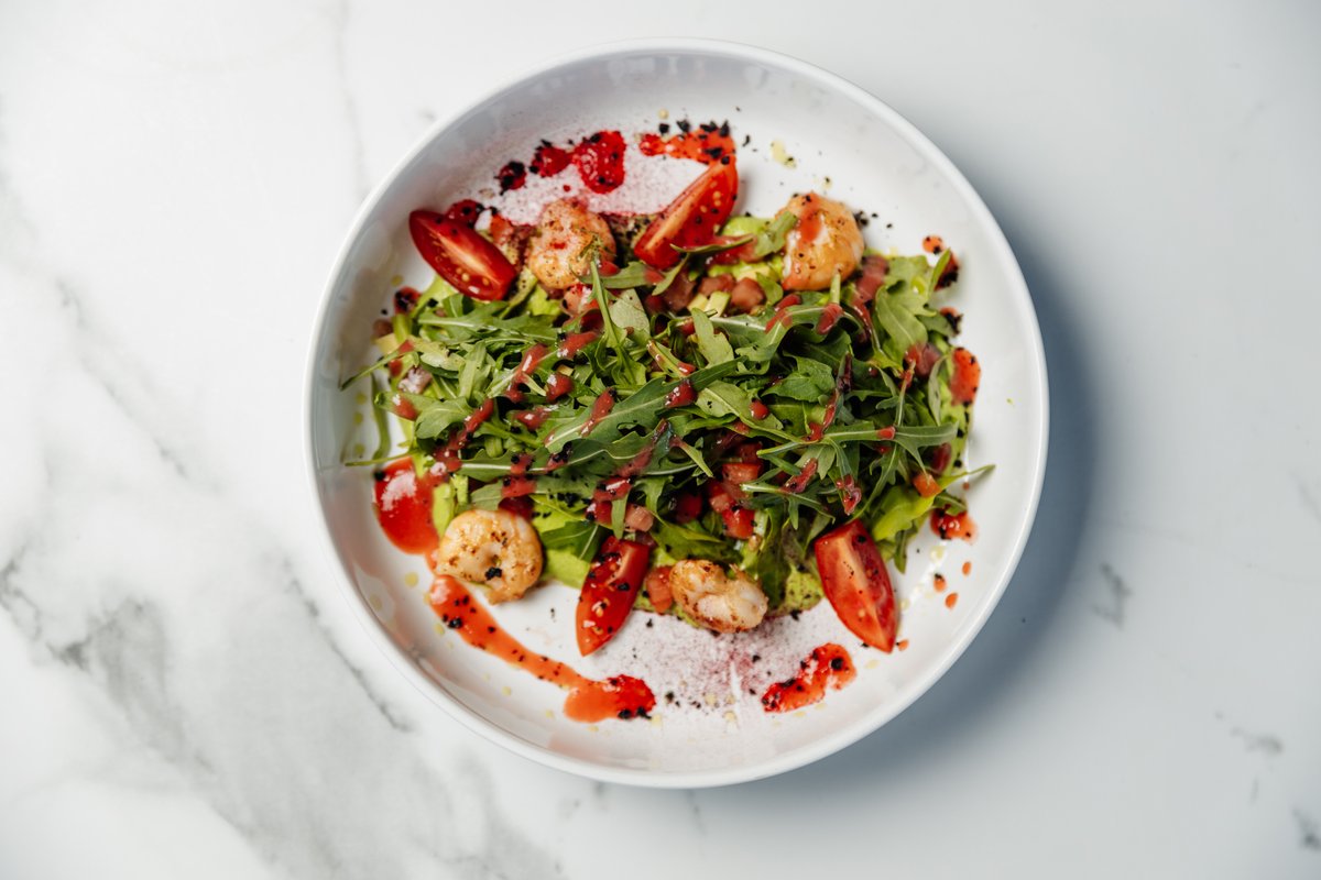 креветки, руккола, авокадо, черри, соус маракуйя чили