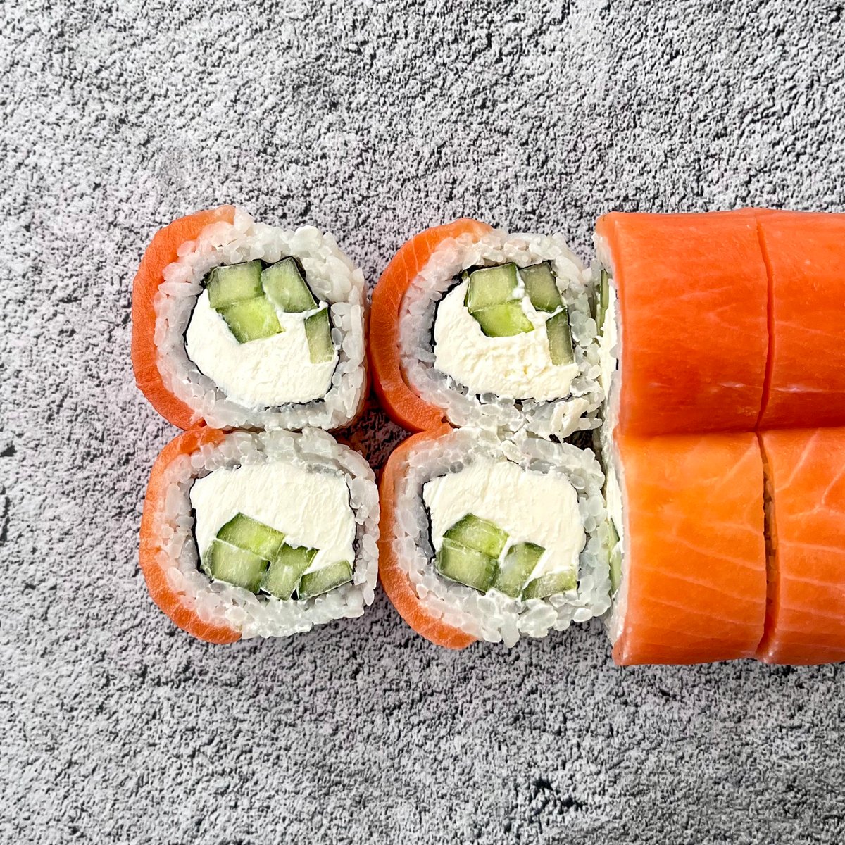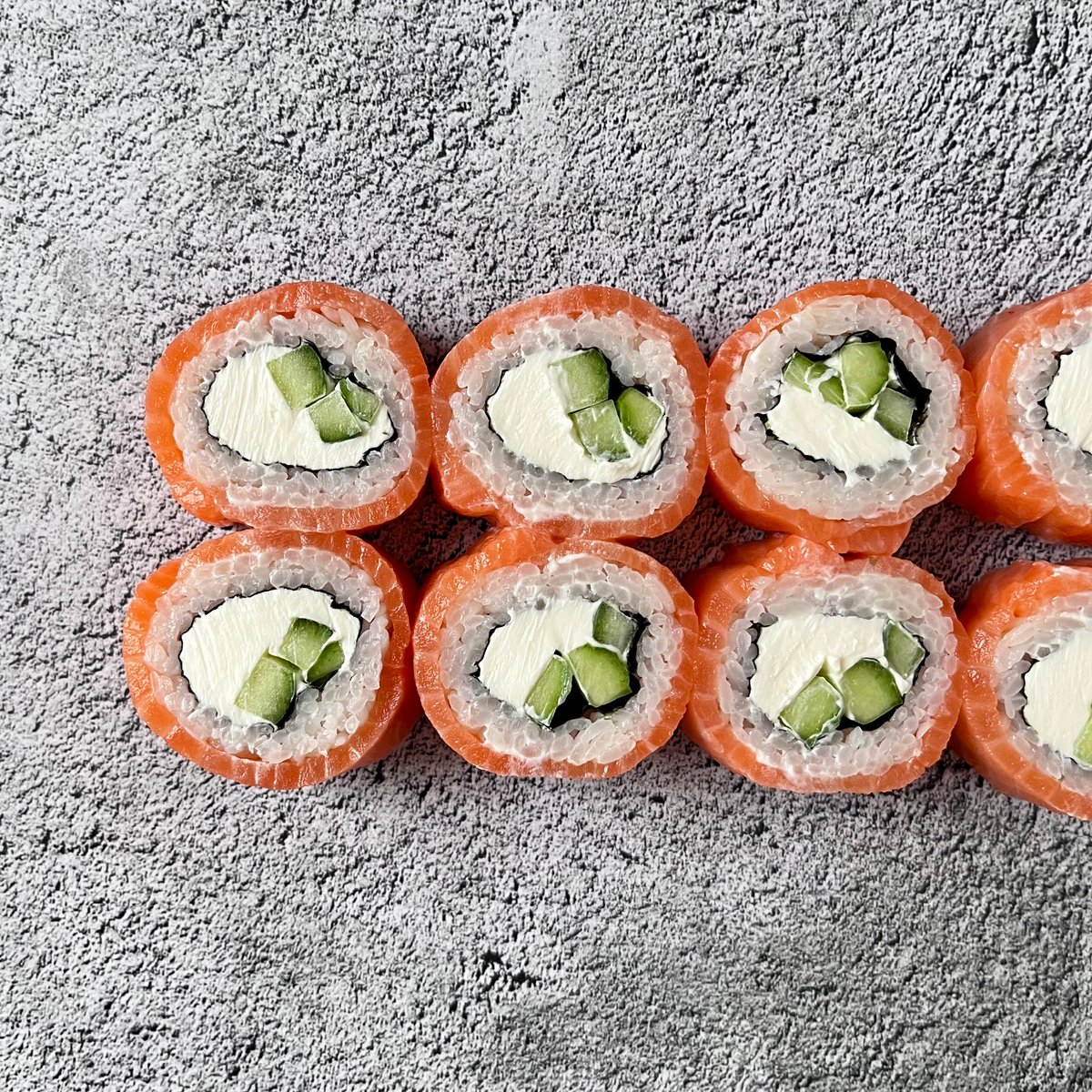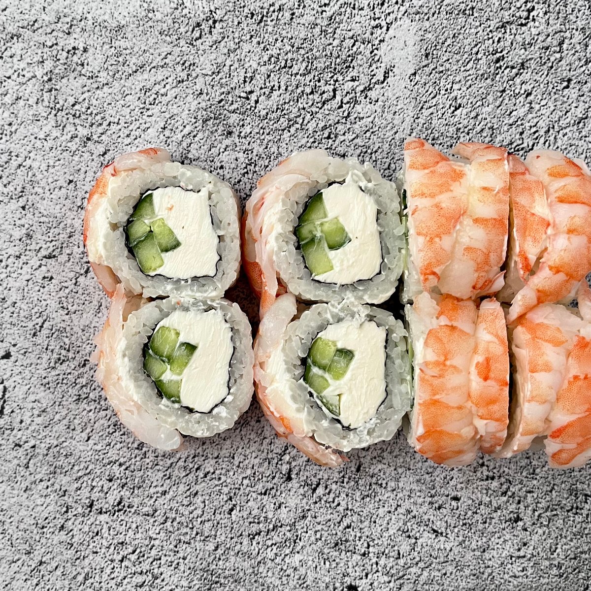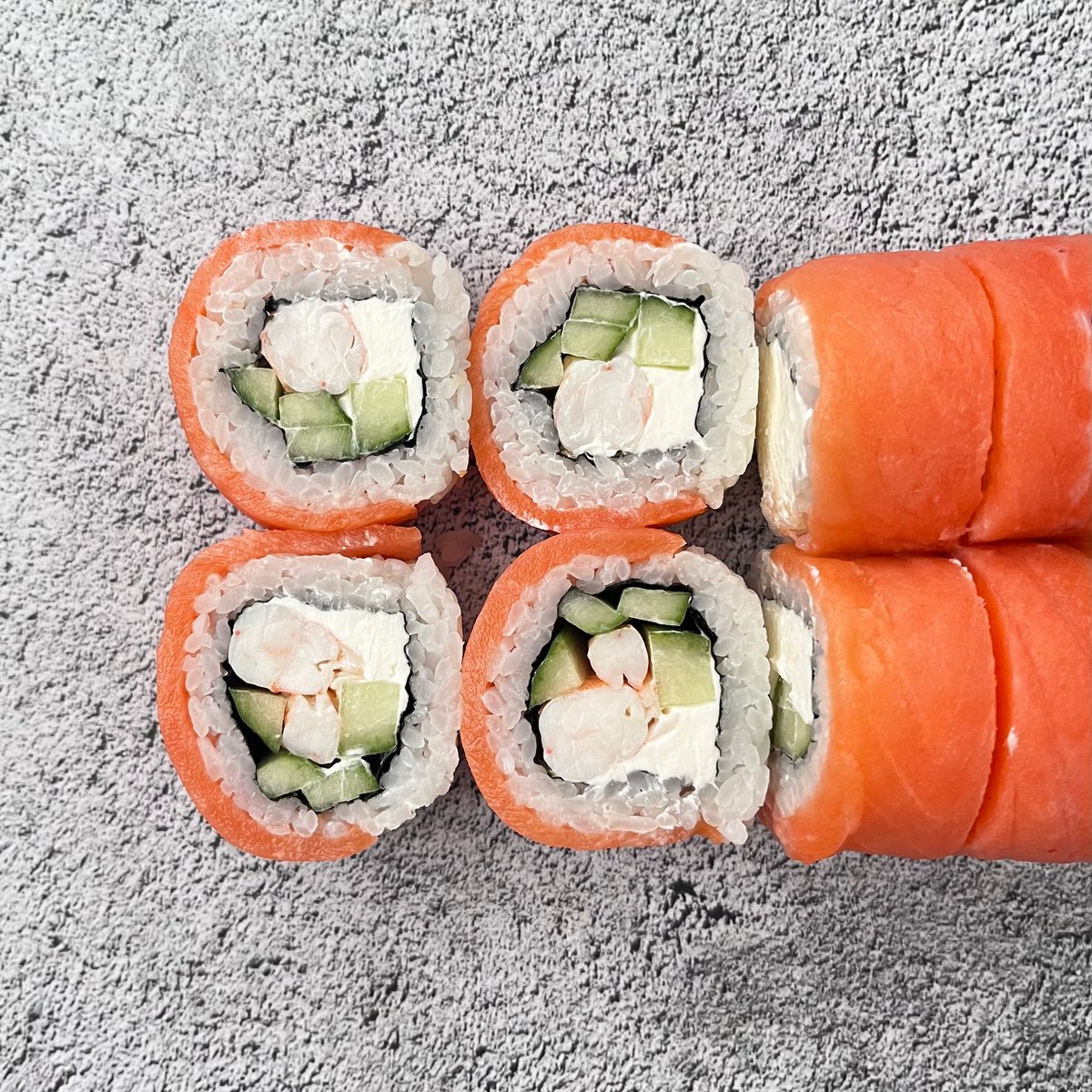 Рис, нори, творожный сыр, огурец, лосось, креветка