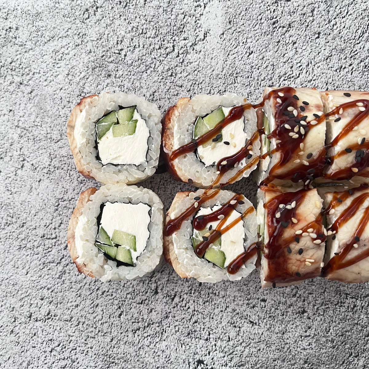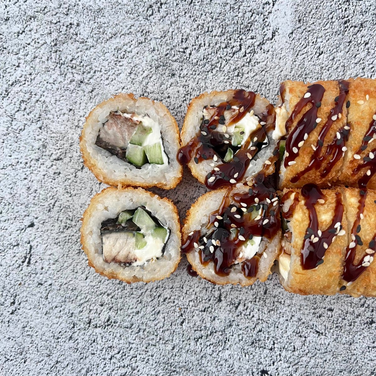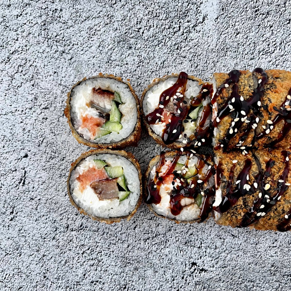 Рис, нори, сыр творожный, лосось, угорь, огурец, панировка, унаги соус, кунжут