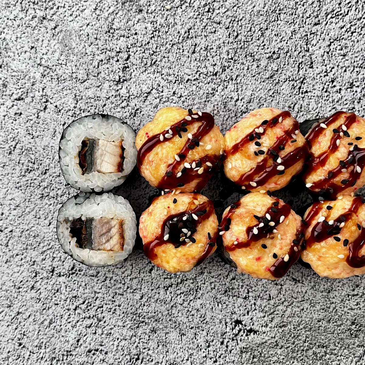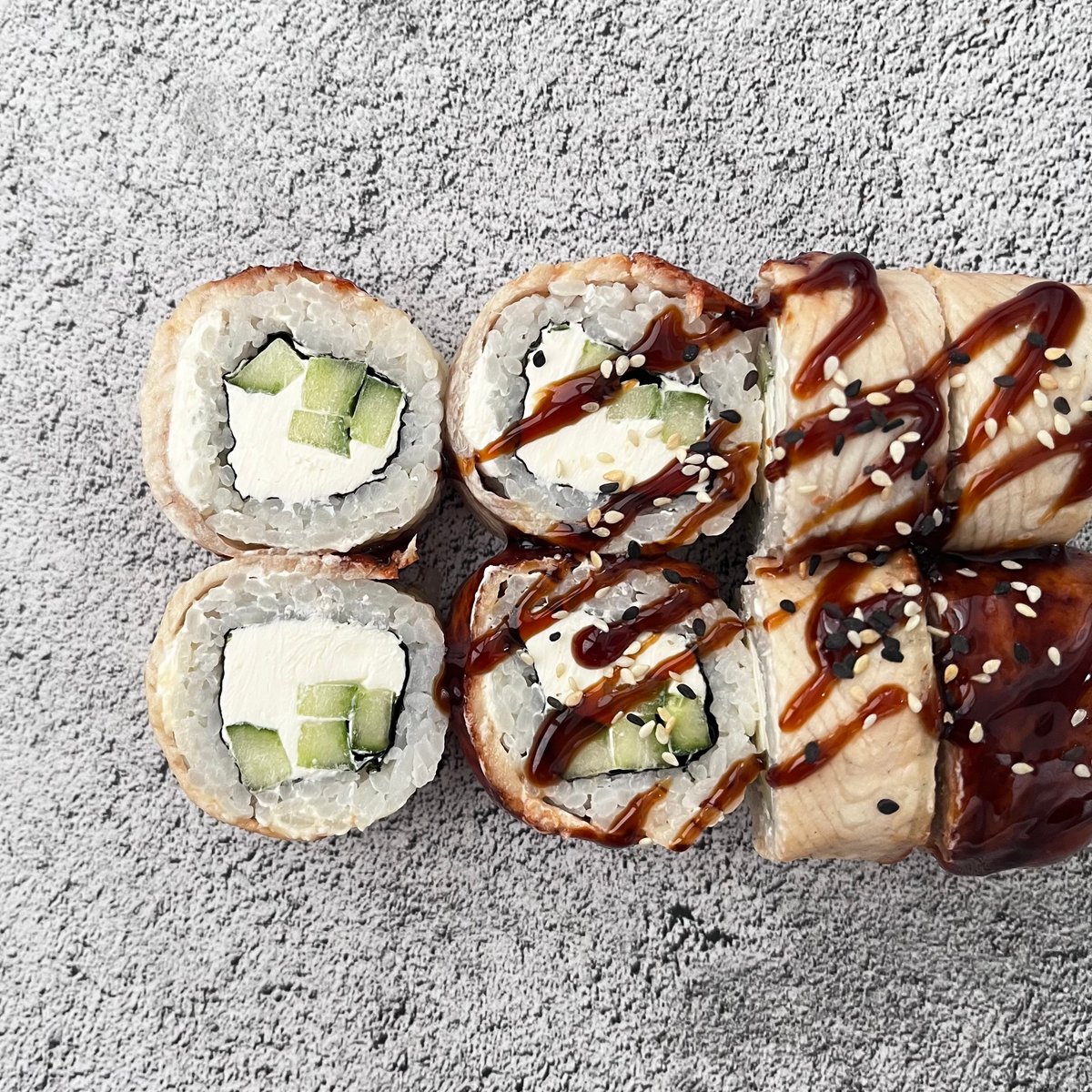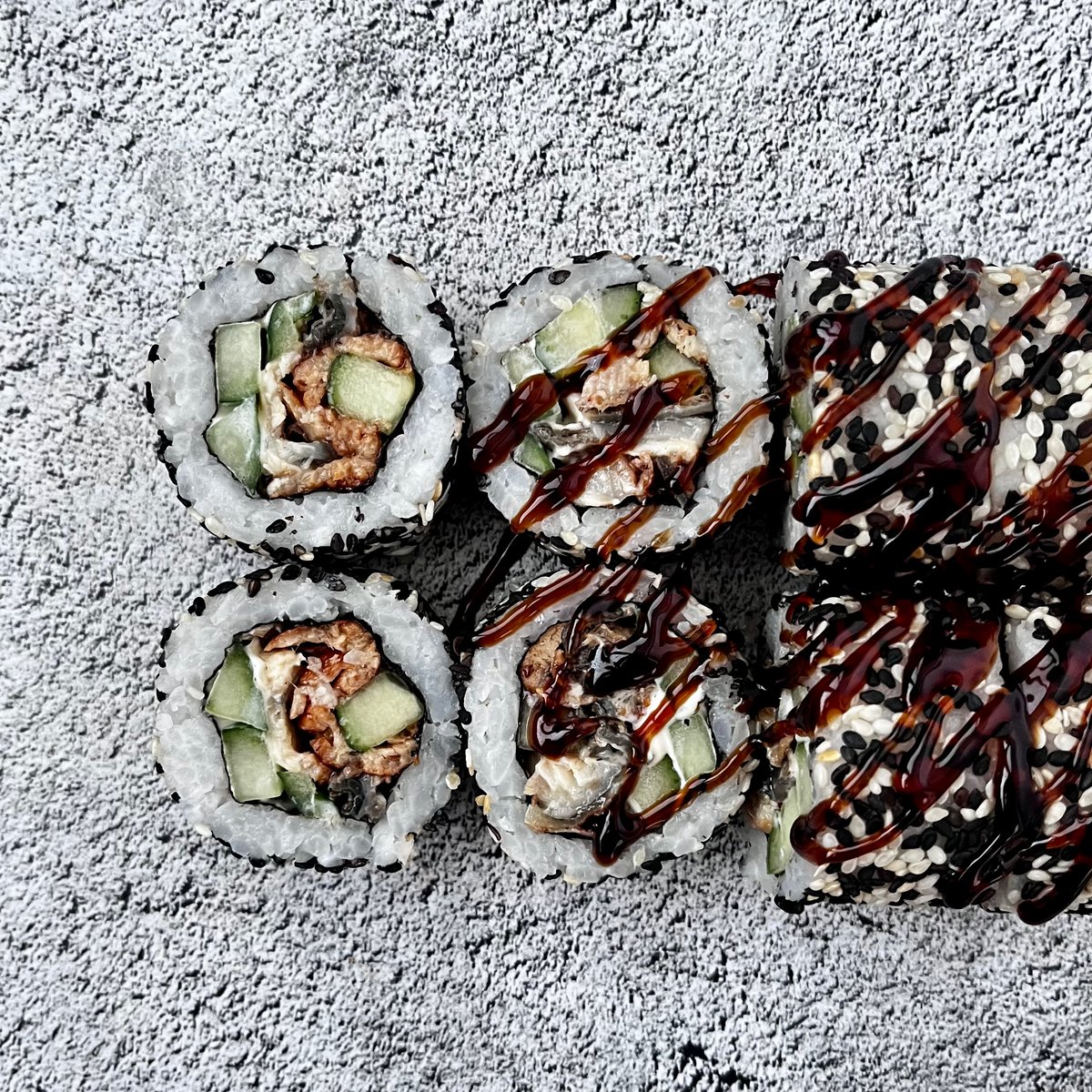 Рис, нори, сыр творожный, лосось, угорь, огурец, панировка, унаги соус, кунжут