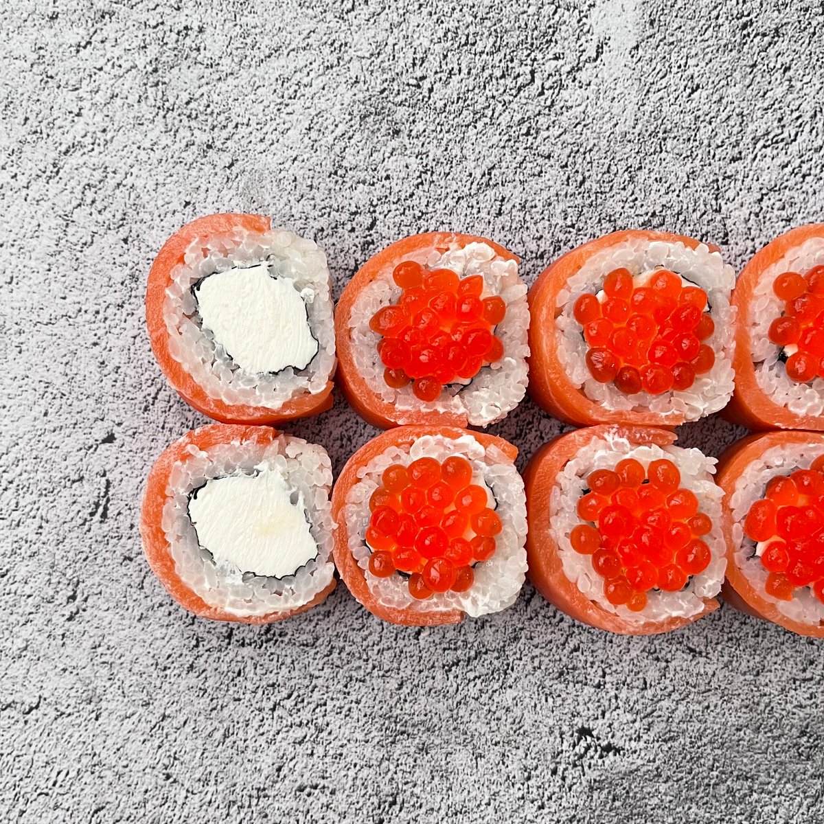 Рис, нори, творожный сыр, лосось, имитарованная икра
