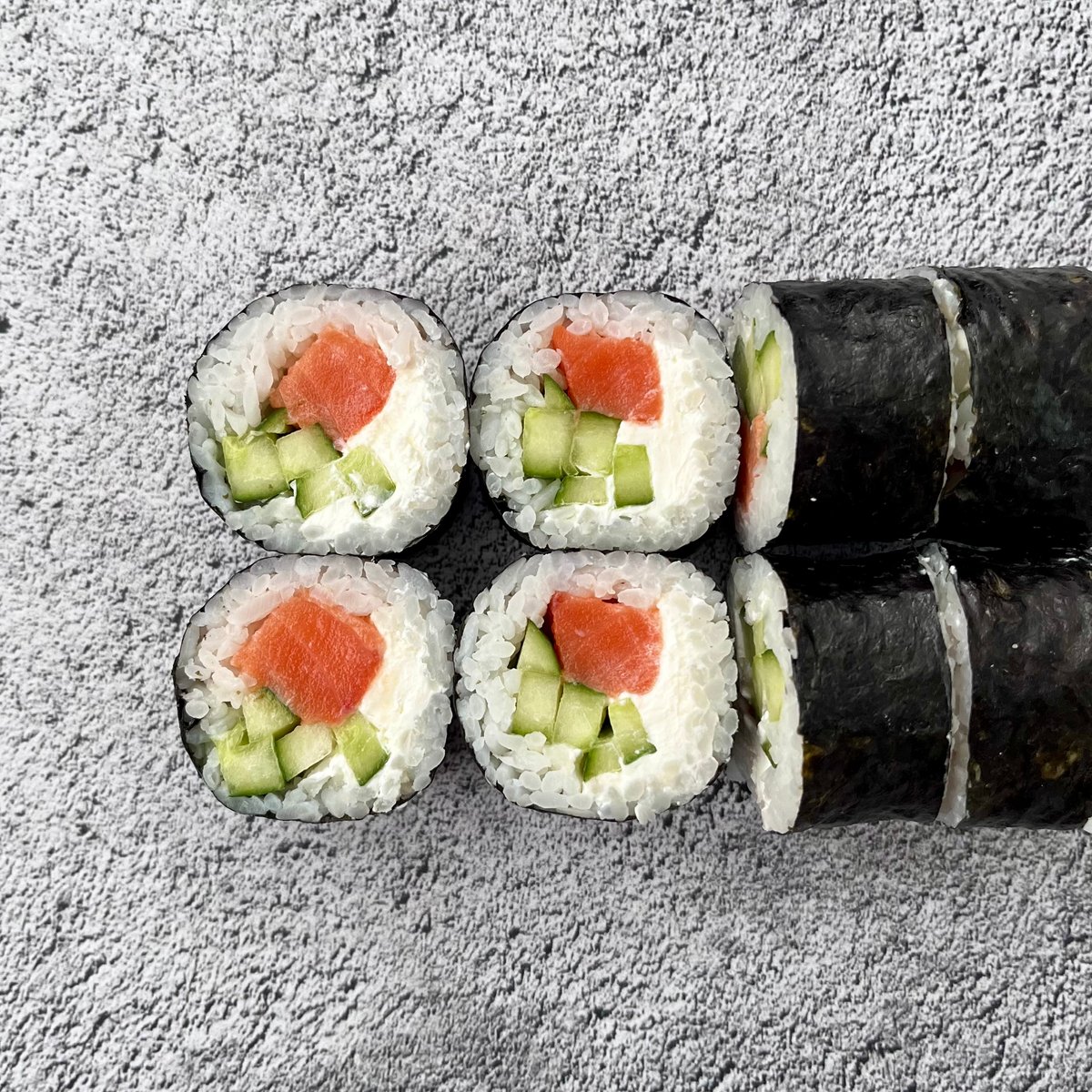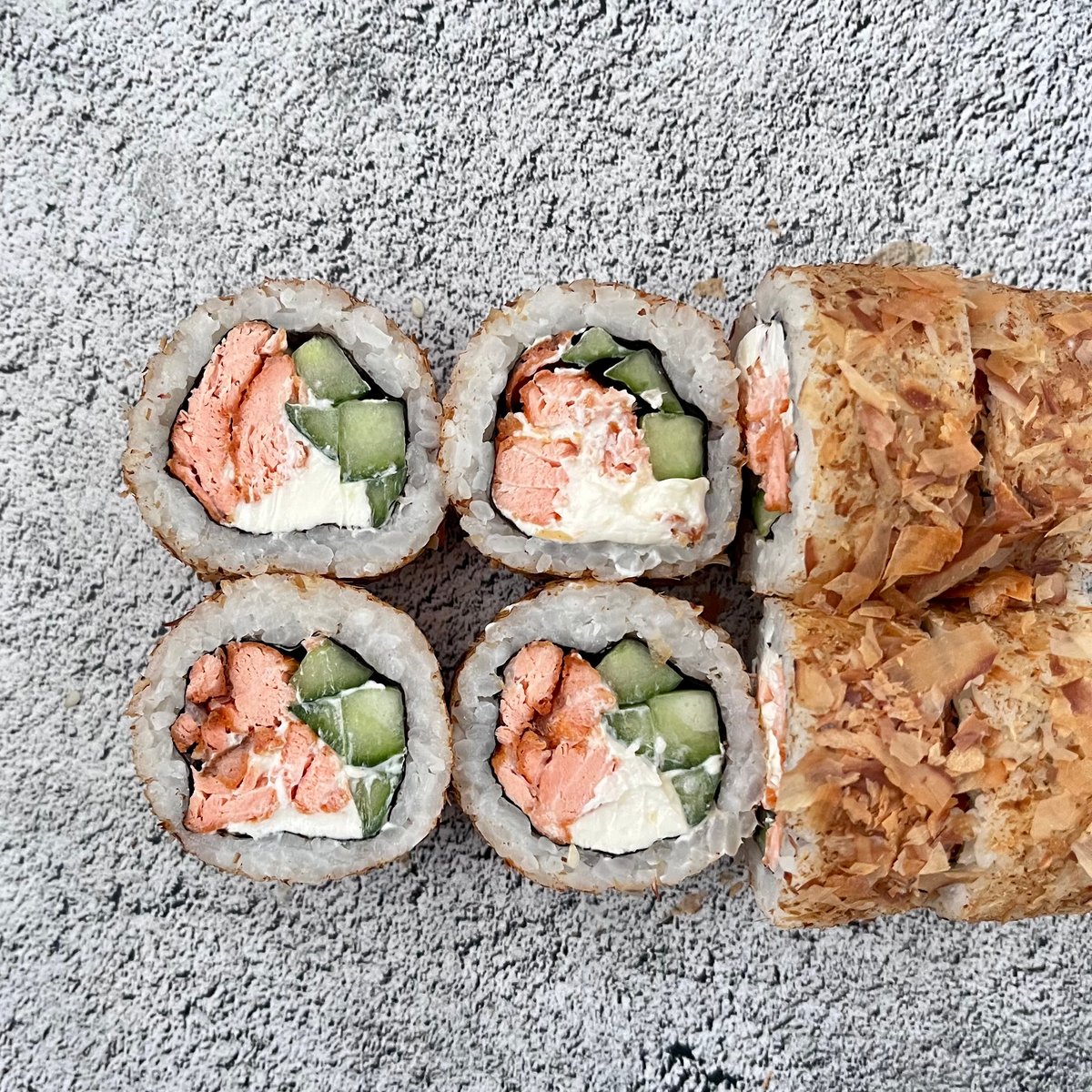 Рис, нори, сыр творожный, огурец, жареный лосось, стружка тунца