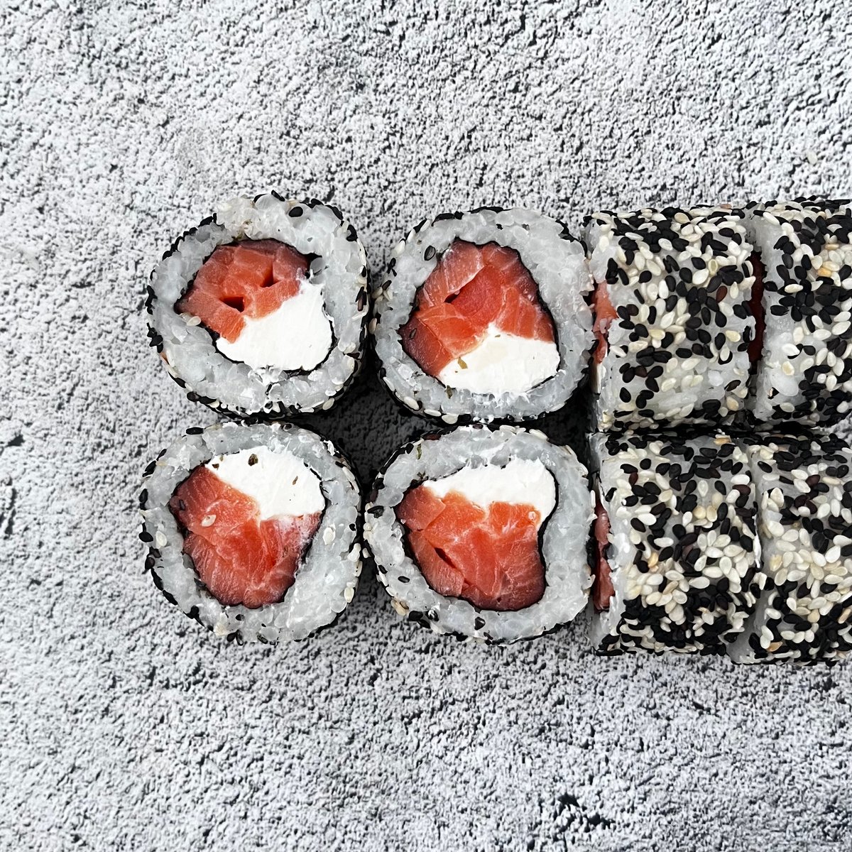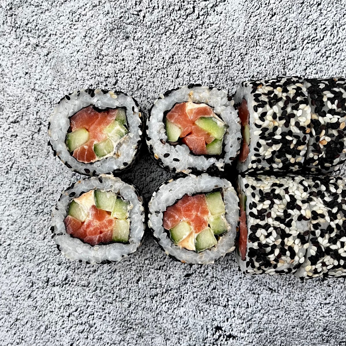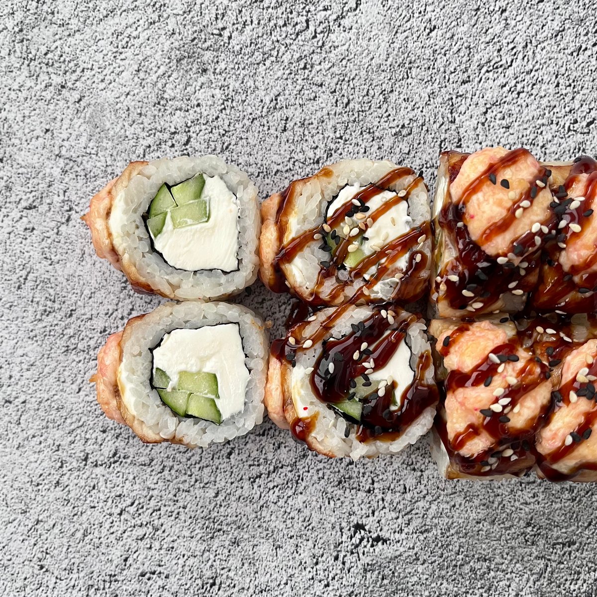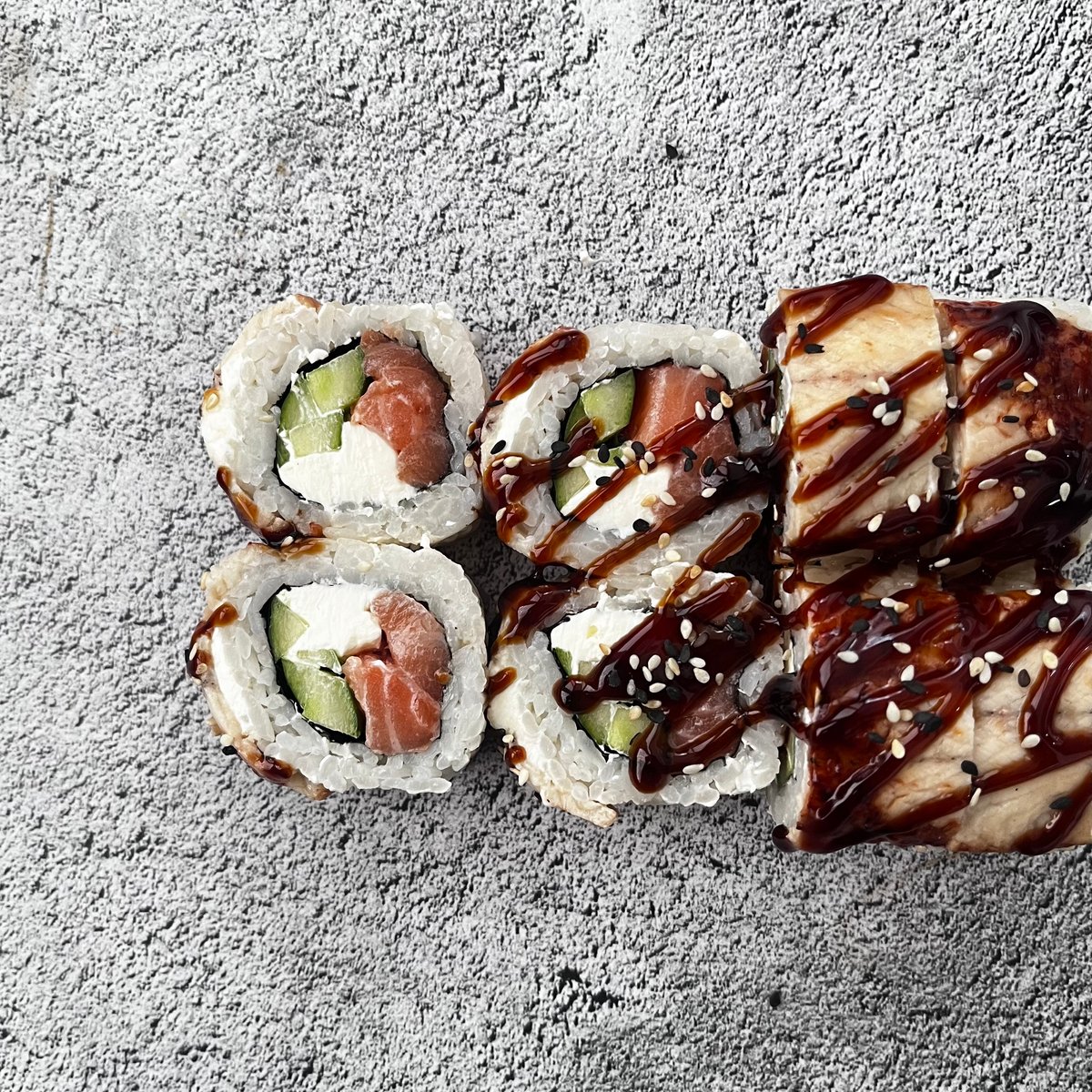 Рис, нори, творожный сыр, огурец, лосось, угорь, унаги соус, кунжут