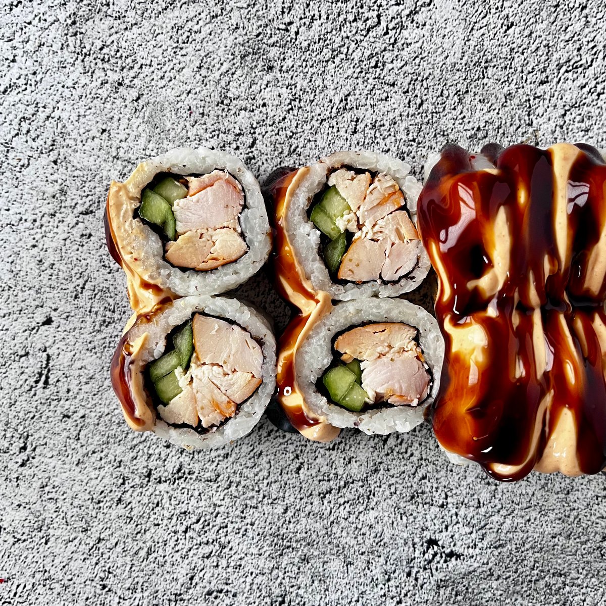 Рис, нори, копченая курица, огурец, спайси соус, унаги соус