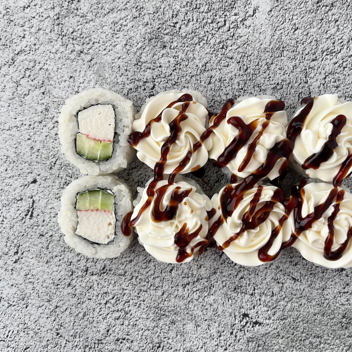 Рис, нори, снежный краб, огурец, сыр творожный, унаги соус