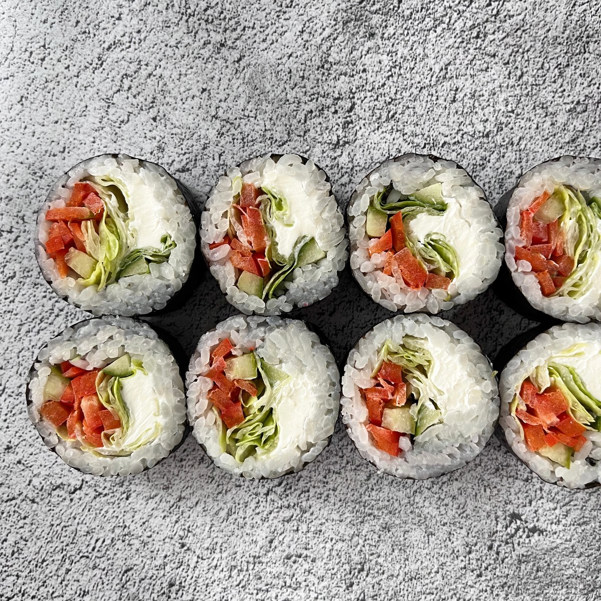 Рис, нори, сыр творожный, огурец, перец, лист салата