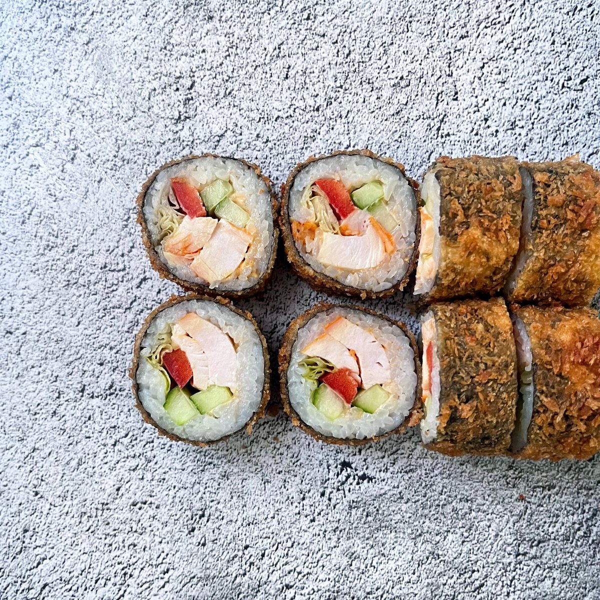 Рис, нори, копченая курица, спайси, огурец, перец, лист салата, панировка