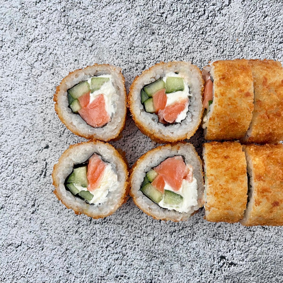 Рис, нори, сыр творожный, лосось, огурец, панировка