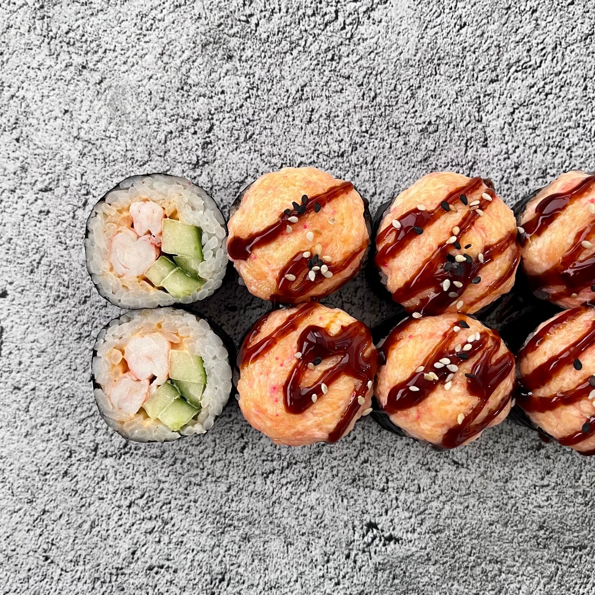 Рис, нори, спайси соус, огурец, креветка, сырный соус, унаги соус, кунжут