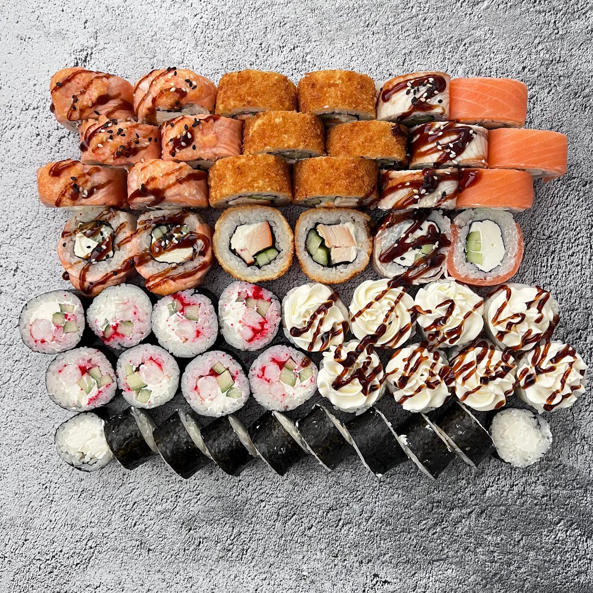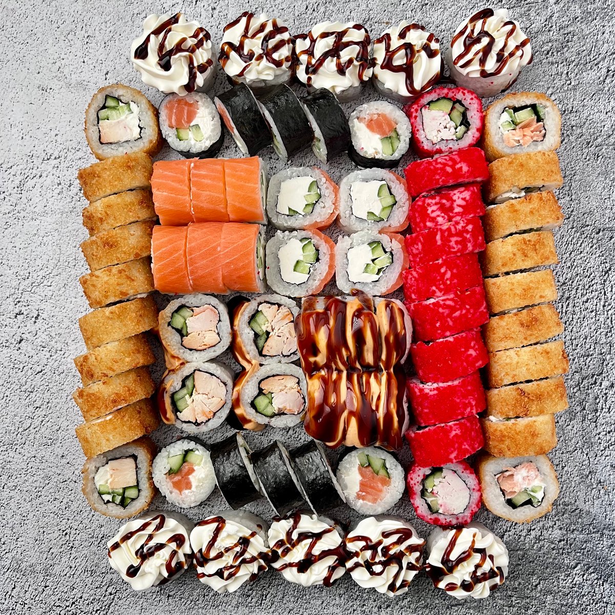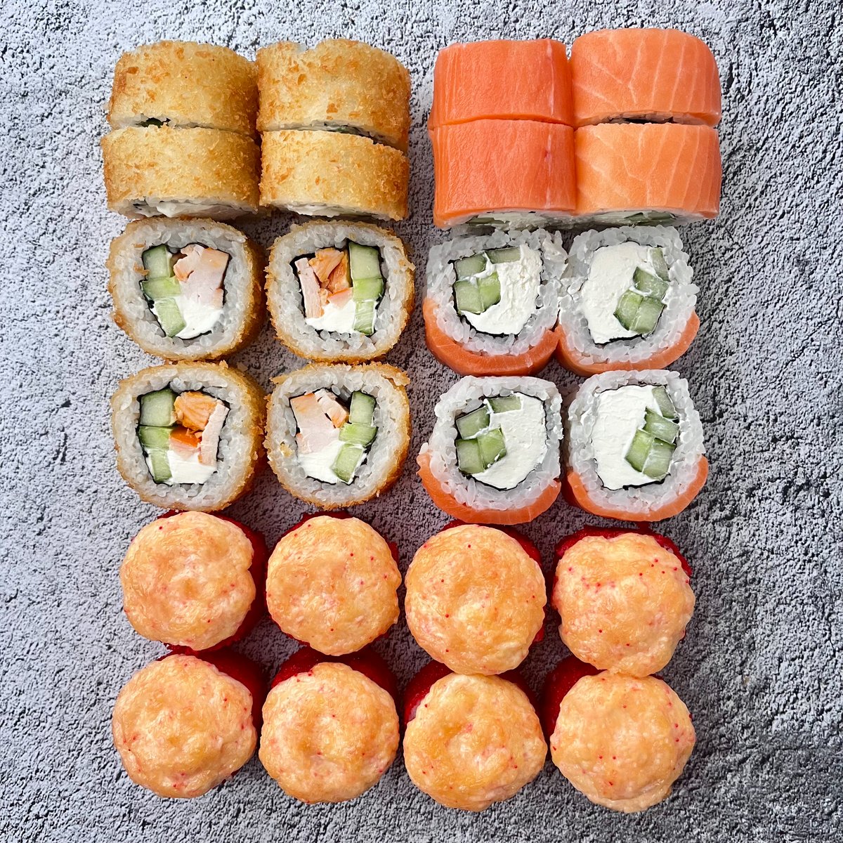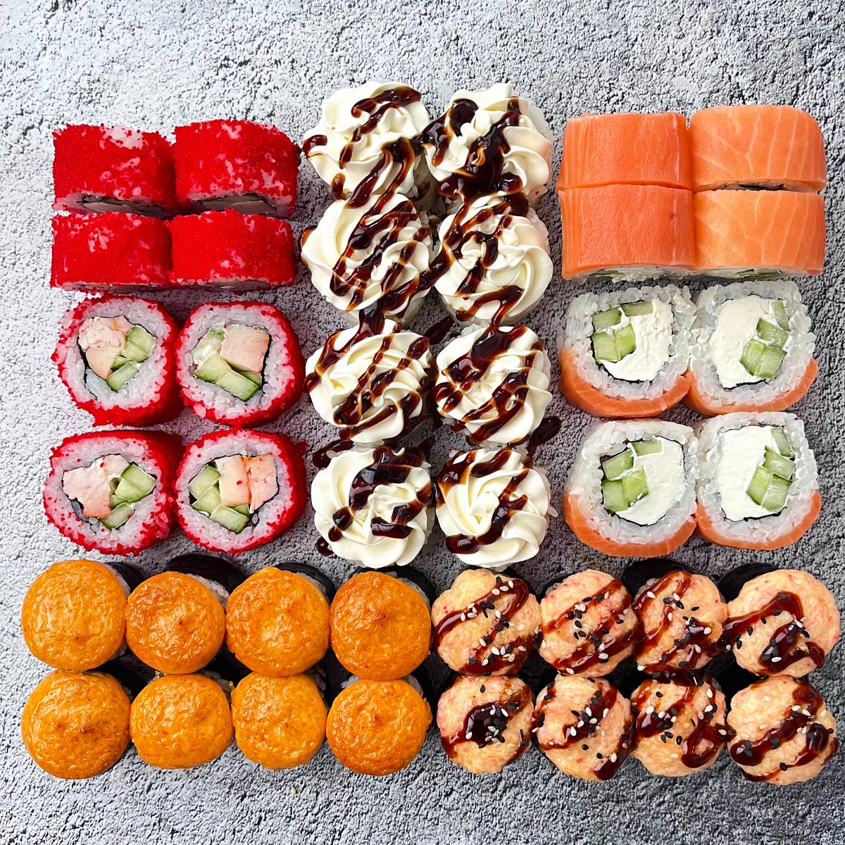 Филадельфия лайт 10 шт, калифорния с крабом 10 шт, тепура чикен 10 шт, темпура лосос 10 шт, снежный 10 шт, гейша 10 шт, тигр 10 шт