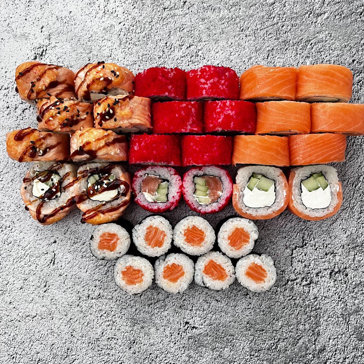 Филадельфия микс 10 шт, чикен ролл 10 шт, запеченный чикен 10 шт, калифорния с крабом 10 шт, маки с огурцом 10 шт, маки с сыром 10 шт, Coca-Cola 1 л
