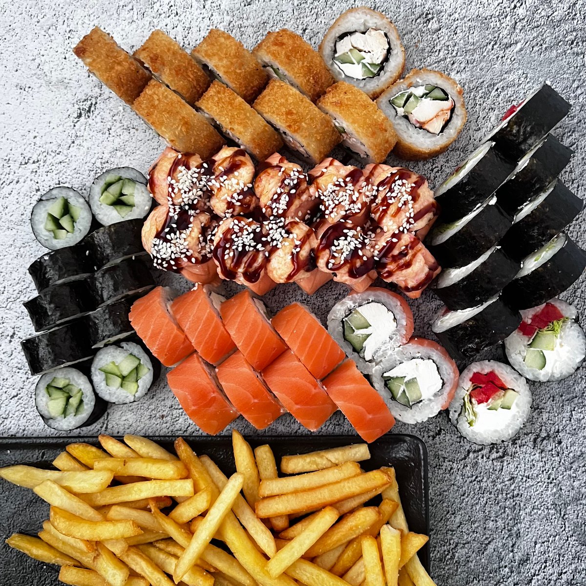 Филадельфия лайт 10 шт, поцелуй гейши 10 шт, темпура чикен 10 шт, гайвайский 10 шт, маки с огурцом 10 шт, фри 1 шт