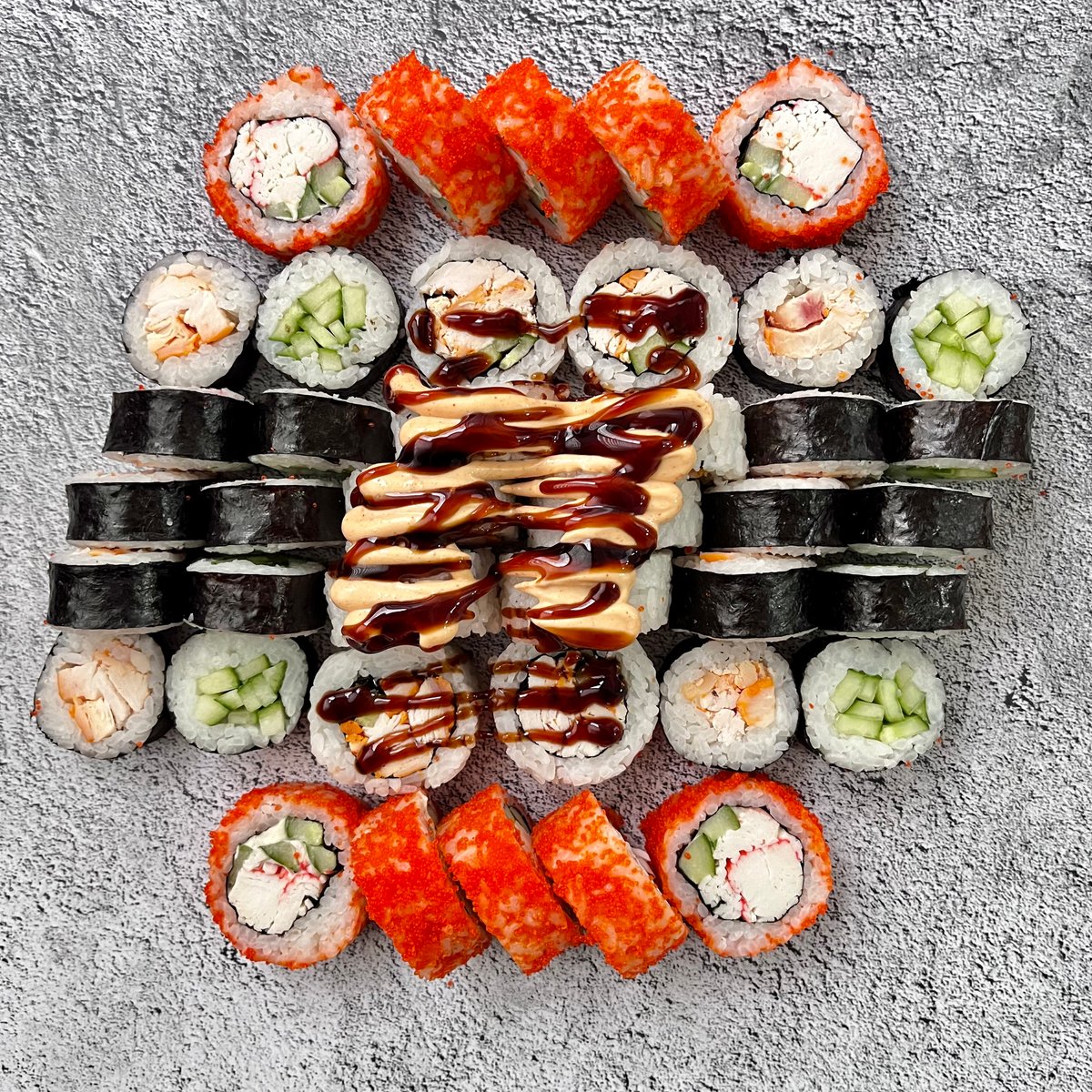 Калифорния с крабом 10 шт, тигр 10 шт, маки с курицей 10 шт, маки с огурцом 10шт