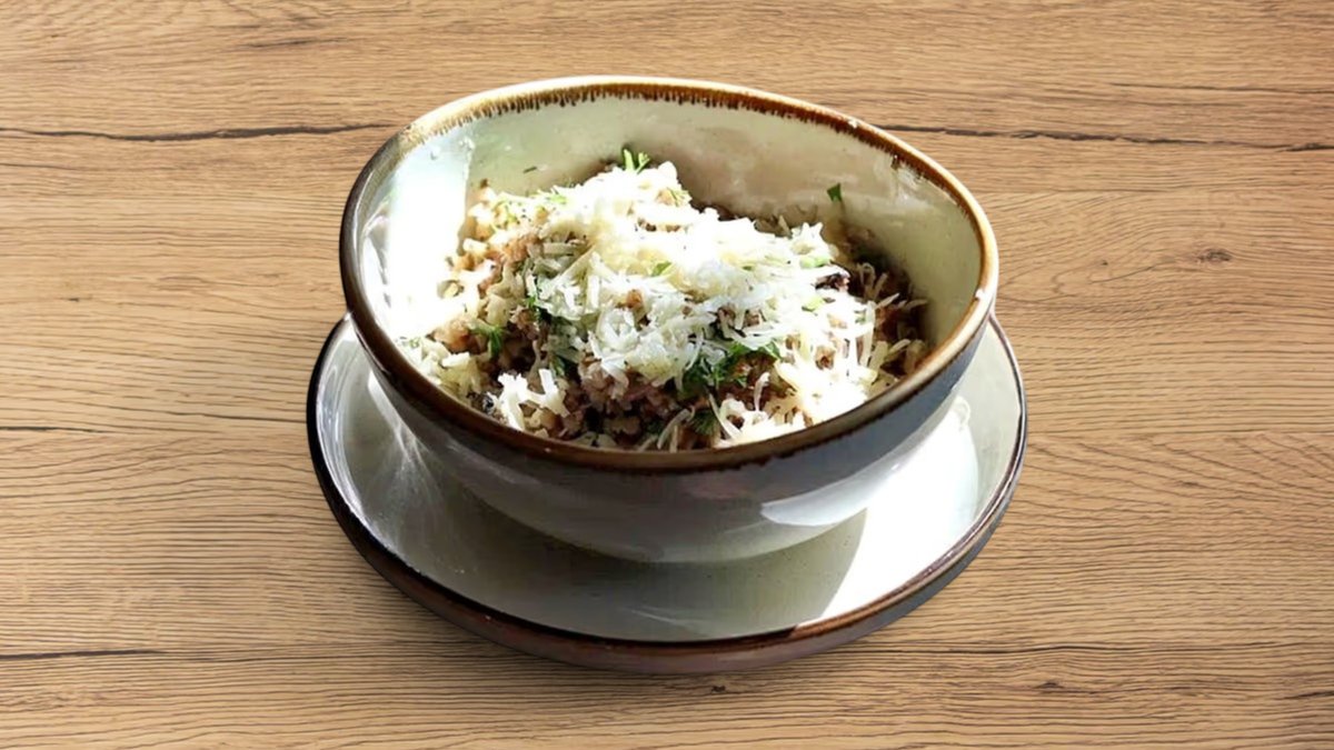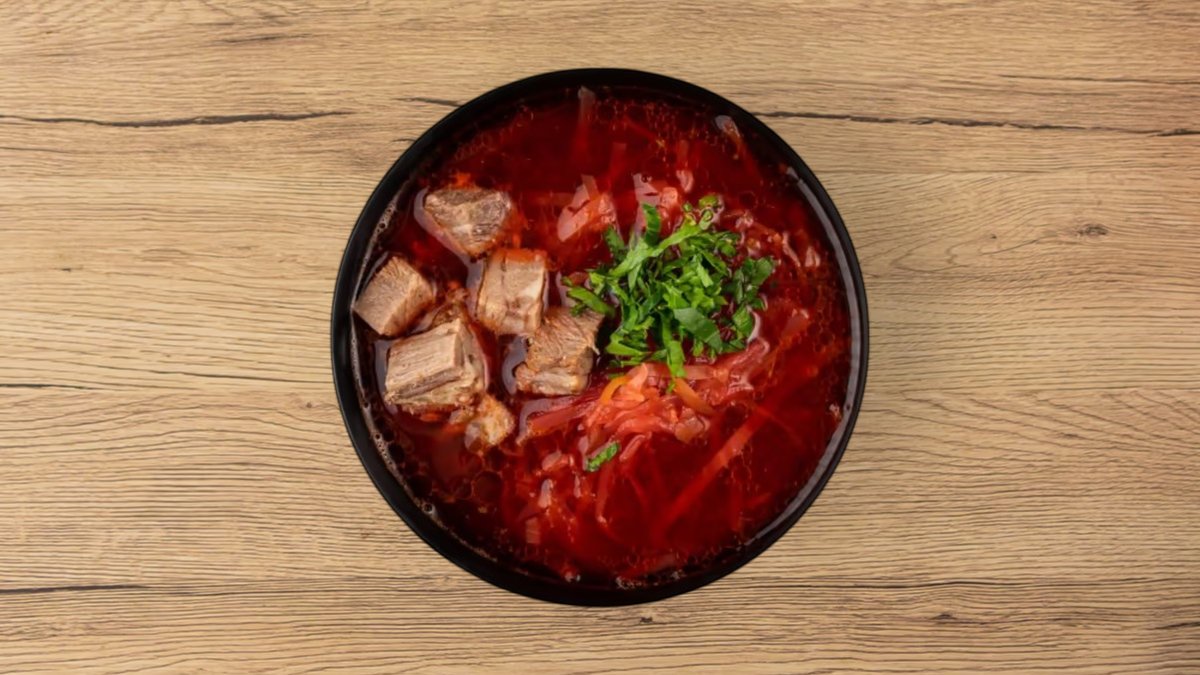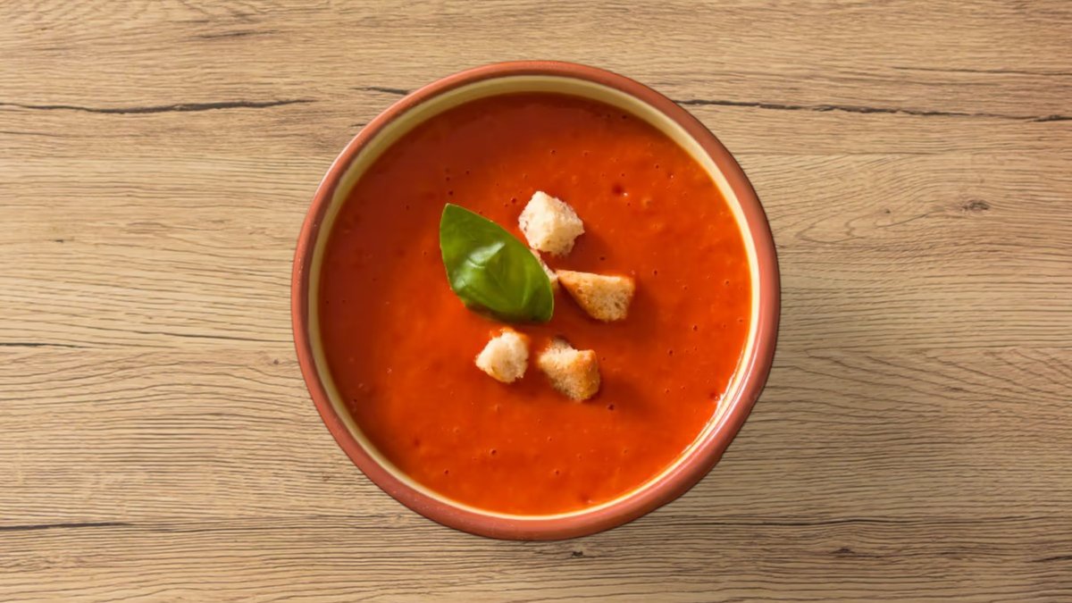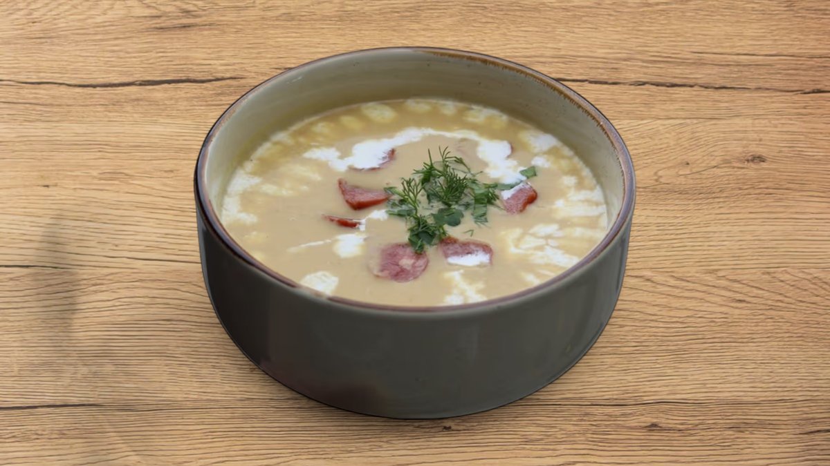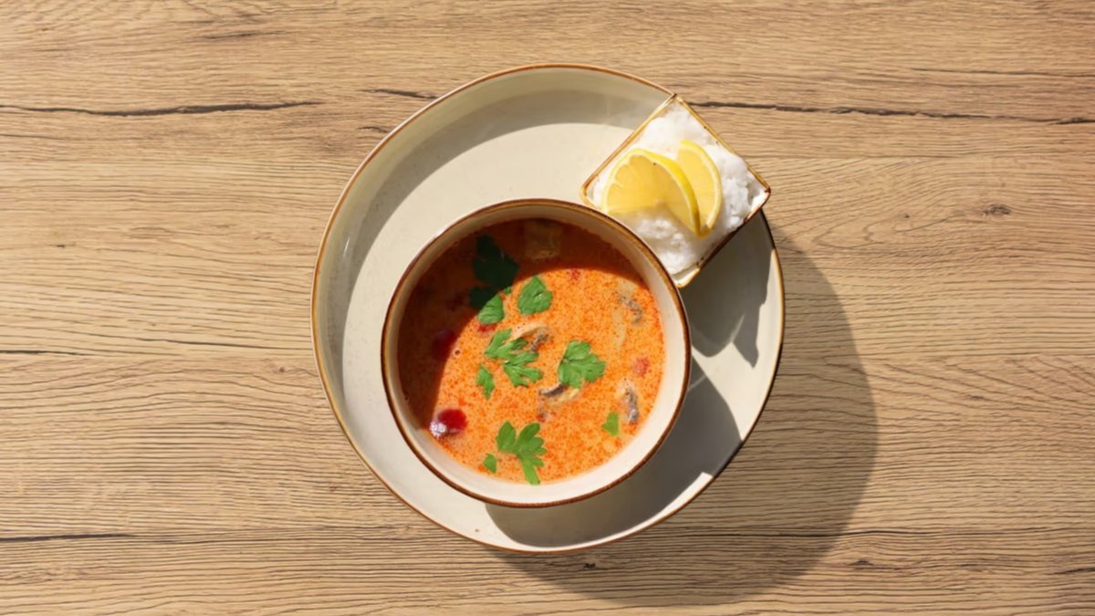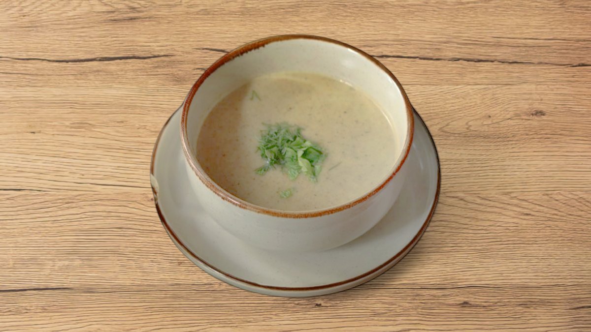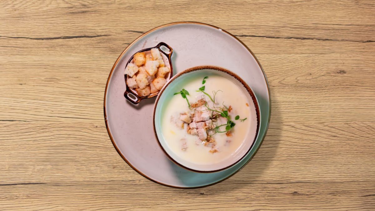 Нежный сливочный бульон с плавленым сыром, запечённым куриным филе, сухариками и микрозеленью.
