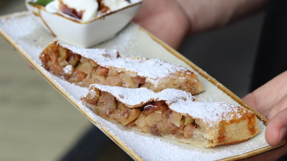 Классический венский десерт с сочной начинкой из яблок, грецких орехов, изюма и корицы, завернутой в тонкое хрустящее тесто. ❗️Подаётся без шарика мороженого.