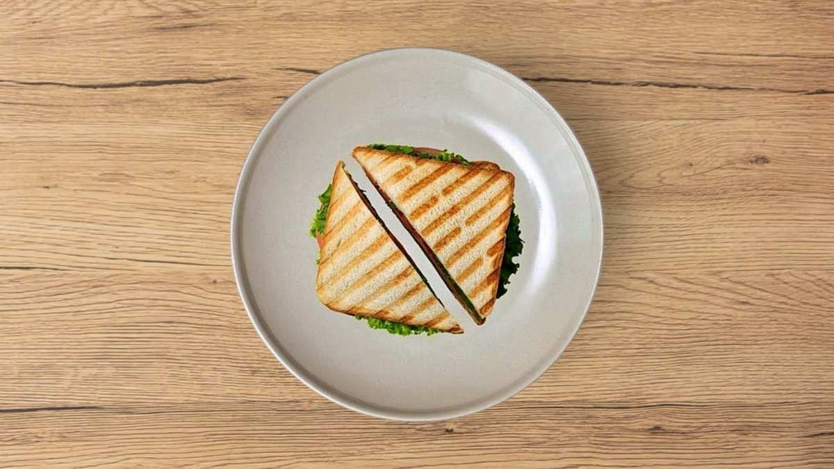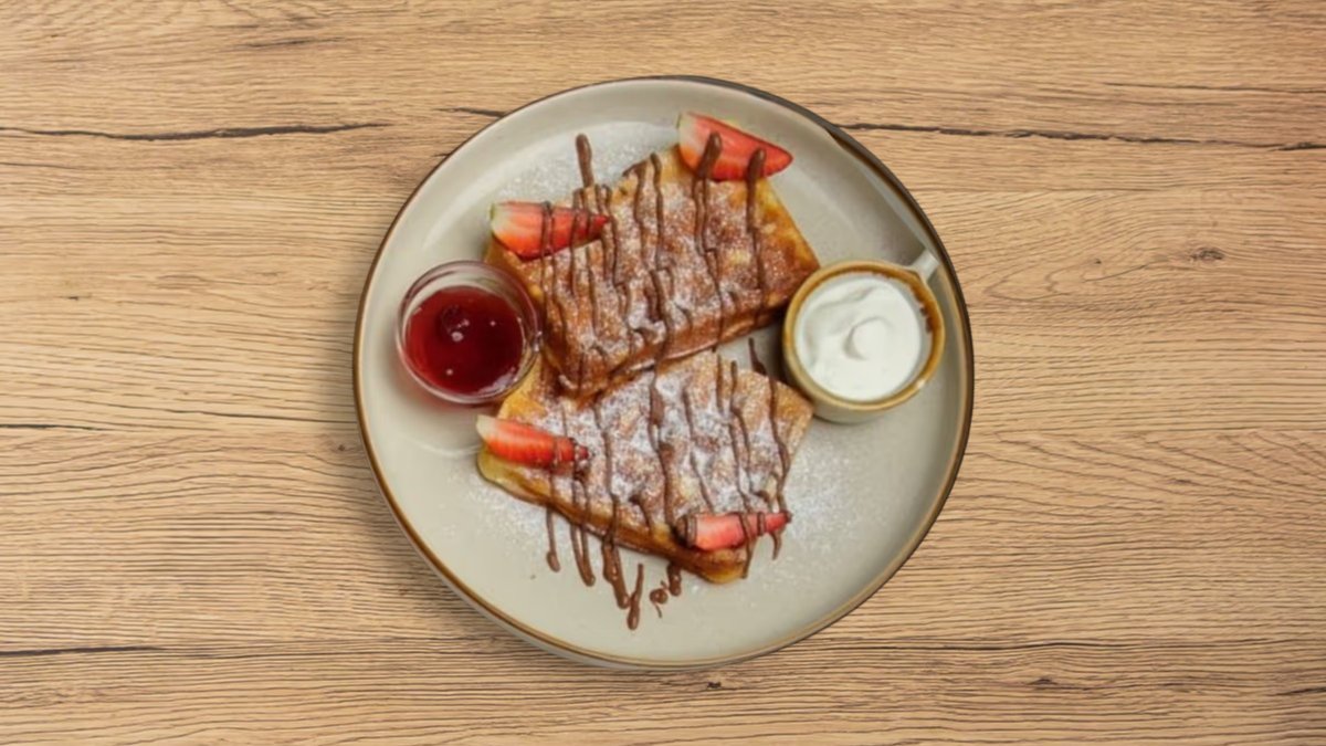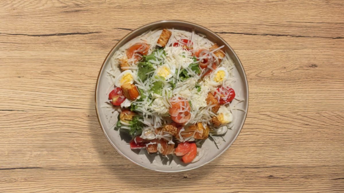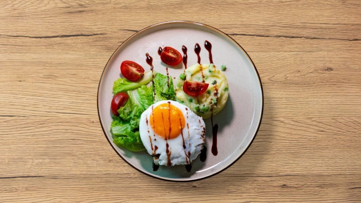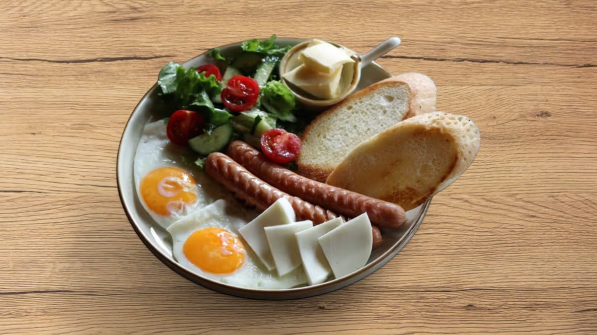 Два жареных яйца, сосиски из говядины, тостовый хлеб, салат из свежих овощей и нежная моцарелла для идеального начала дня.