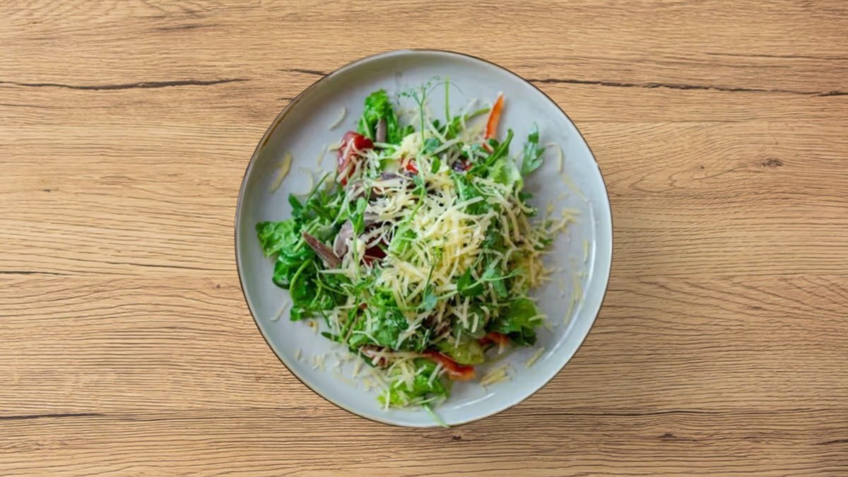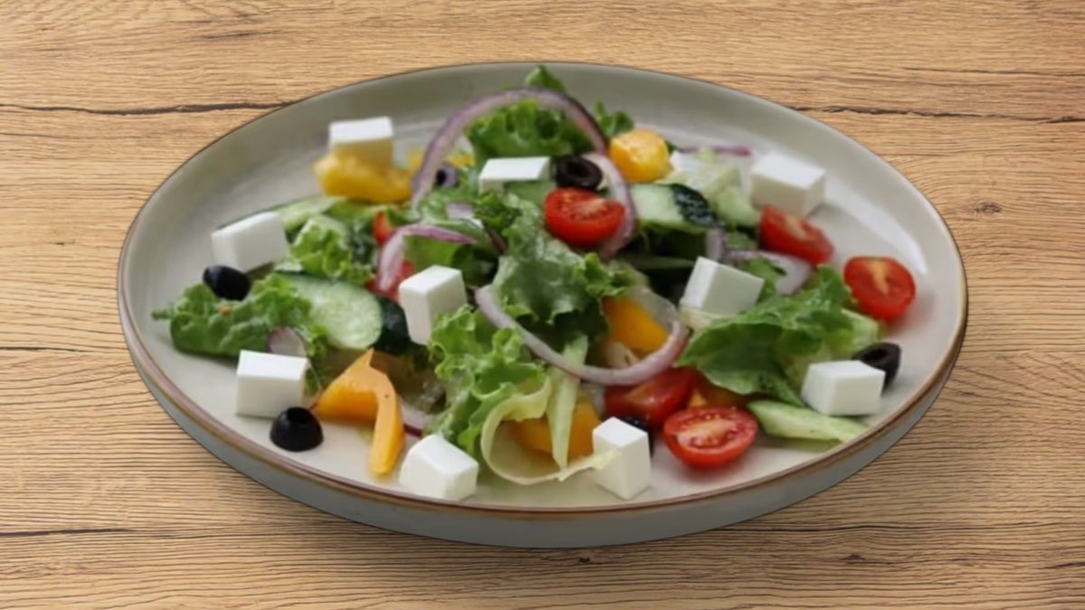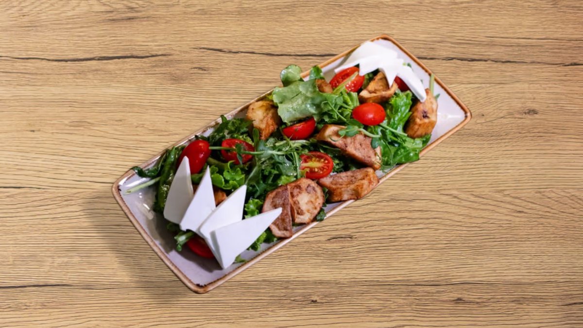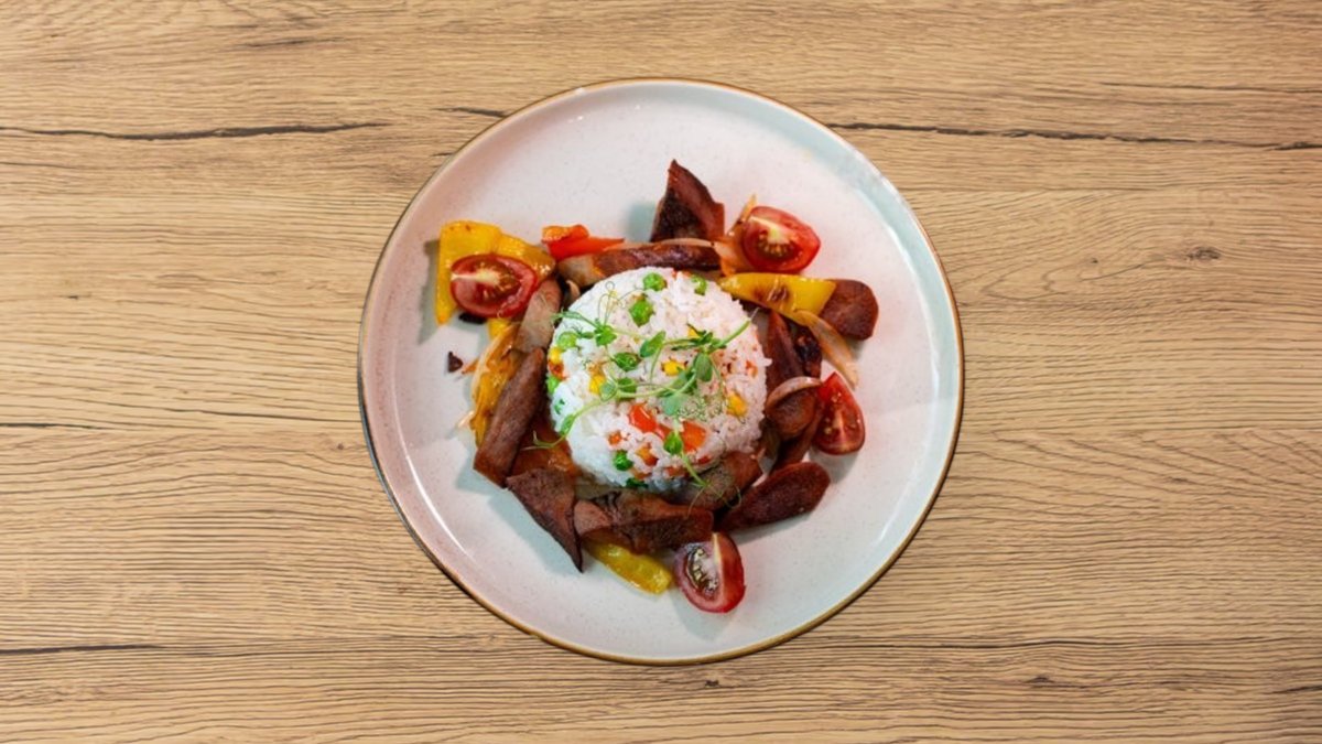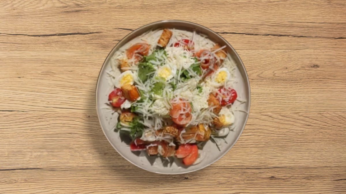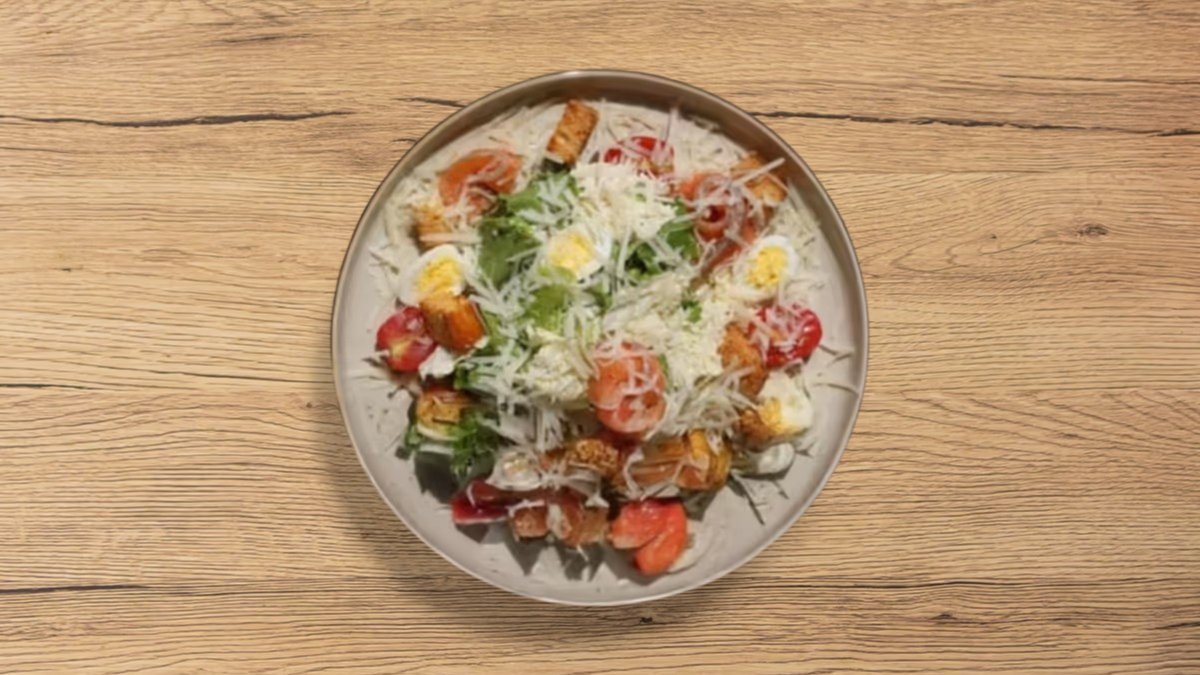 Два жареных яйца, сосиски из говядины, тостовый хлеб, салат из свежих овощей и нежная моцарелла для идеального начала дня.