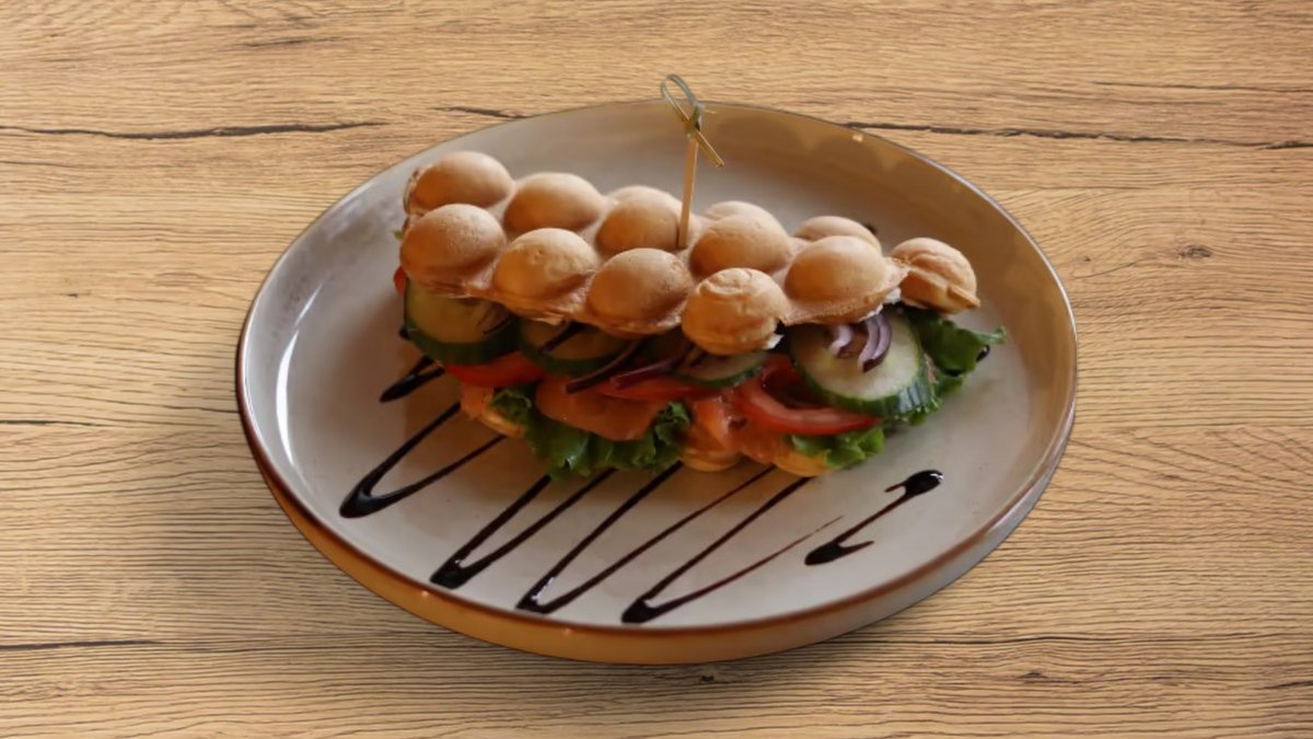 Воздушная вафля со слабосолёным лососем, крем-чизом и свежими овощами, идеально сбалансированная для вкусного перекуса.