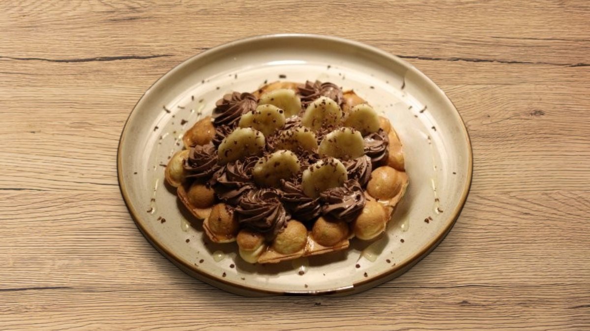Хрустящая снаружи и нежная внутри, с ломтиками спелого банана, щедрой порцией шоколадного соуса и посыпкой из тёртого шоколада.