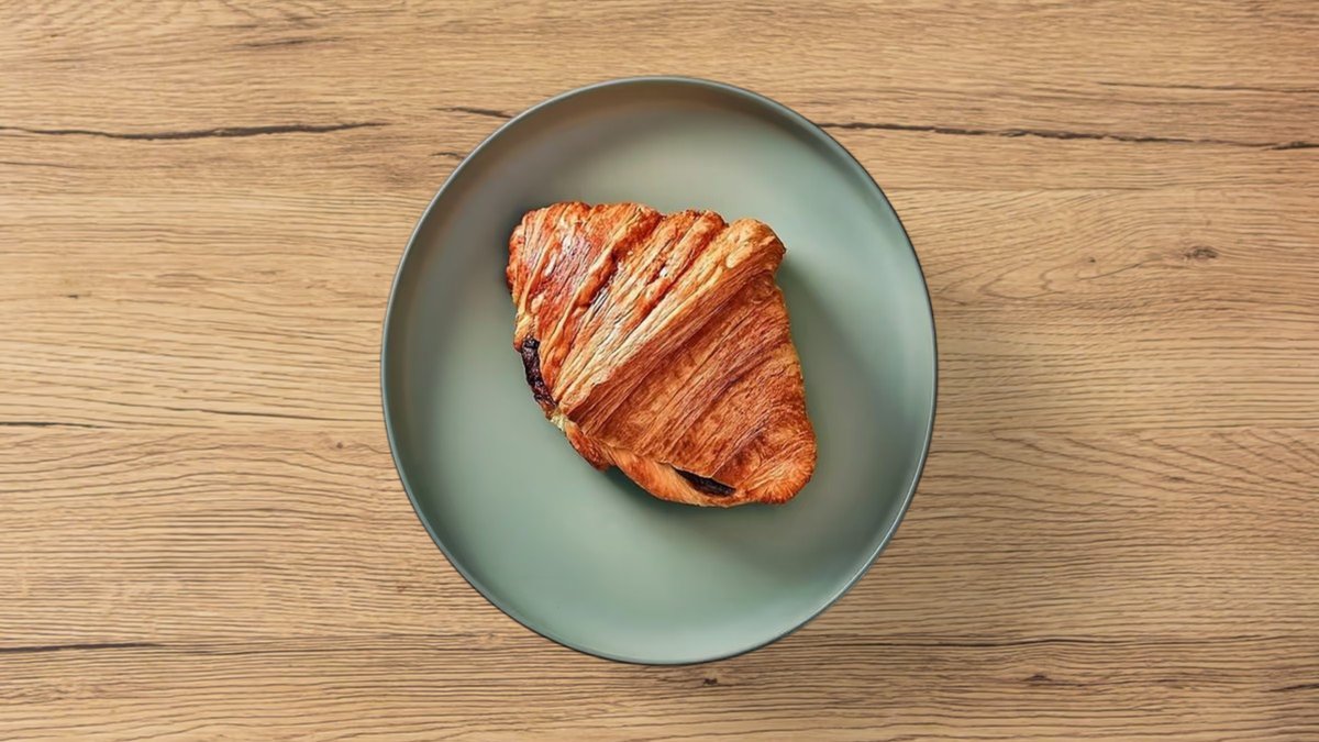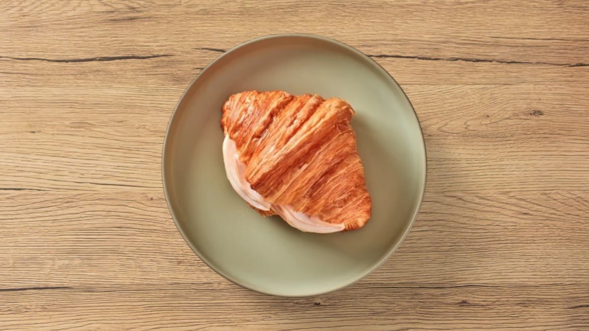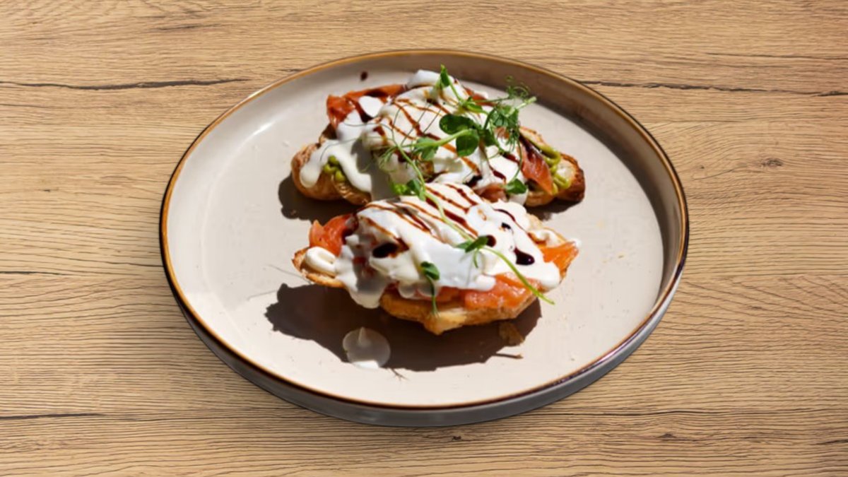 Круассан с нежным авокадо-кремом, крем-чизом, яйцами, форелью и микрозеленью под бальзамик-кремом.