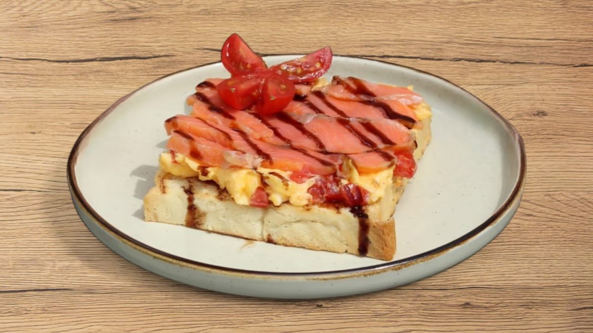 Воздушный яичный скрэмбл и слабосолёная сёмга на поджаренном тостовом хлебе.