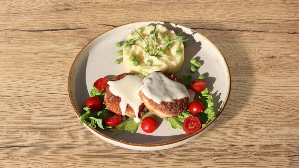 Две нежные котлеты с сырным соусом, черри, листьями салата и кремом бальзамик. Подаются без гарнира (на фото в качестве гарнира — картофельное пюре).