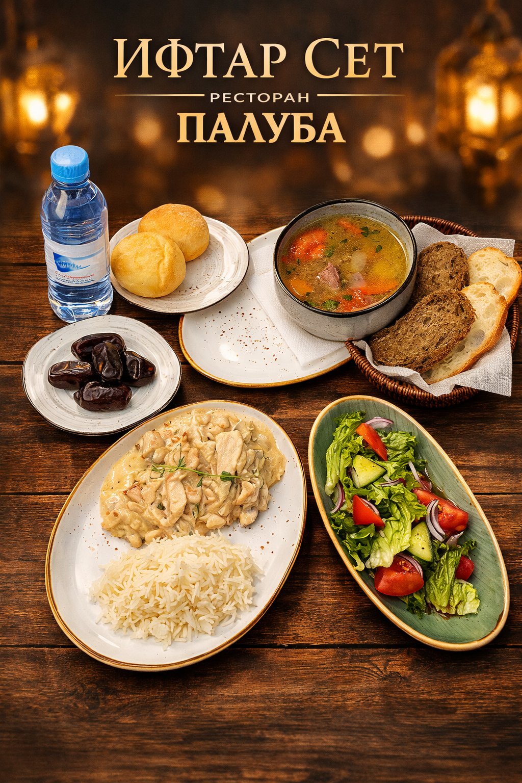 В комбо входят три блюда: Салат из свежих овощей с греческой заправкой 150гр Шурпа из баранины 300гр Курица в сливочном соусе с рисом на гарнир 300гр Финики и вода 0.5 в подарок 🌙