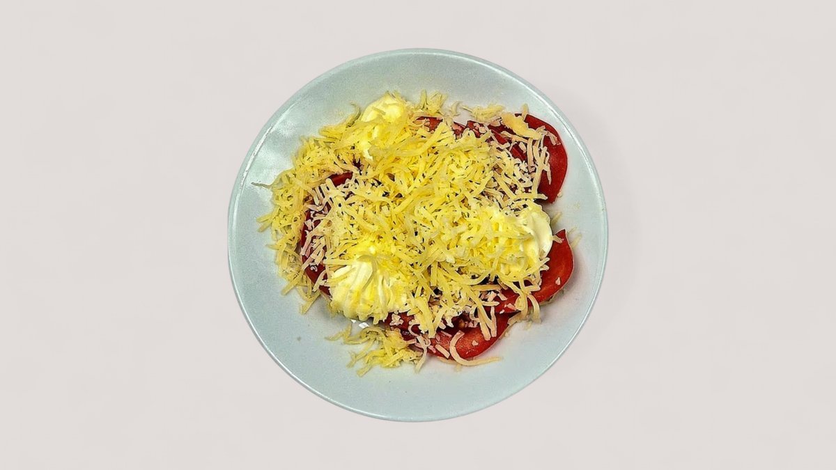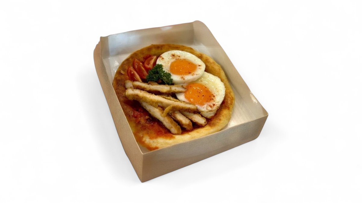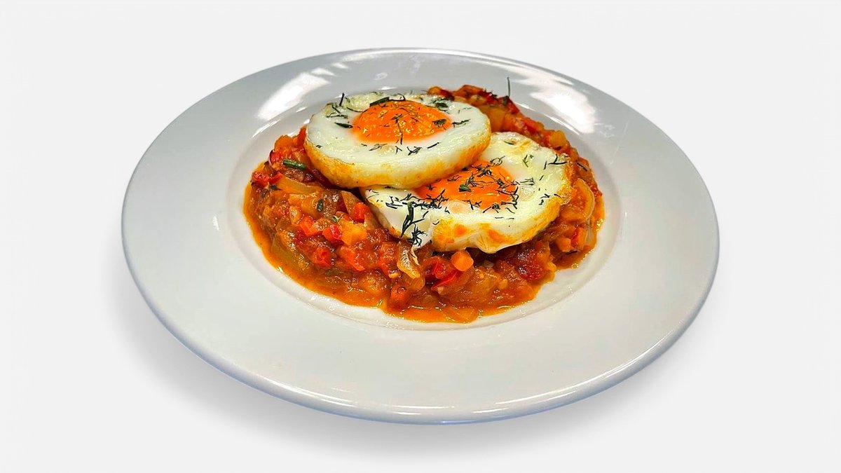 Яйца жареные 2 шт., лук репчатый, перец болгарский, помидоры, чеснок, паста томат, бульон костный , специи. 100/170 гр.