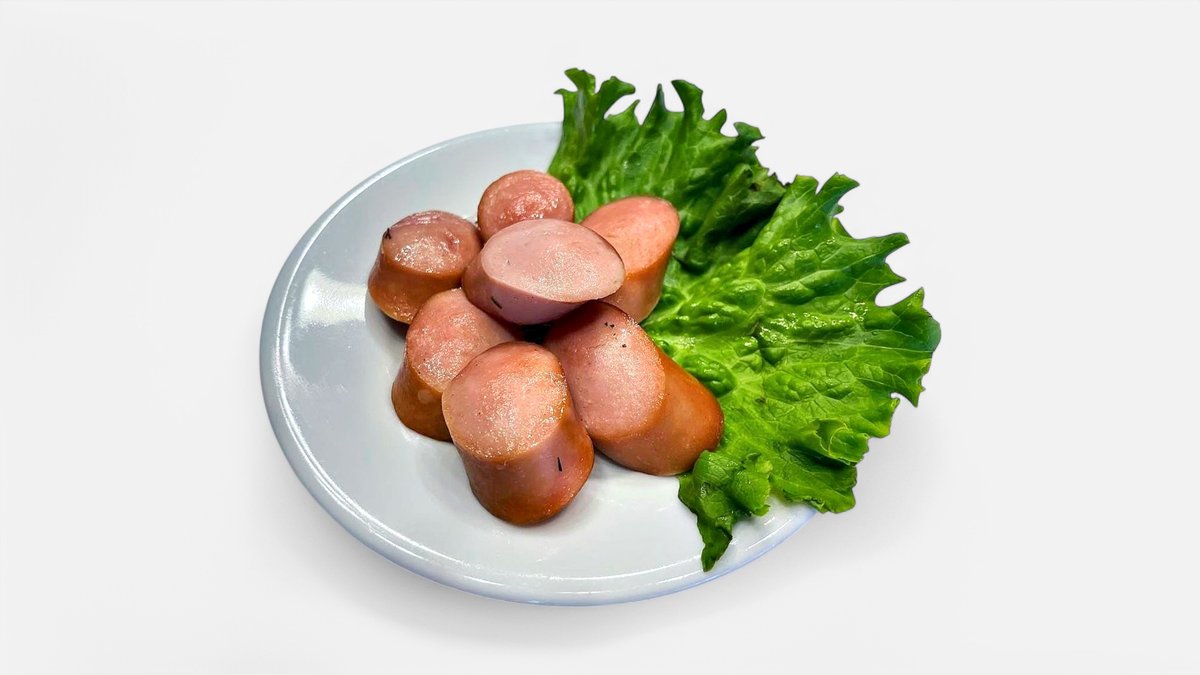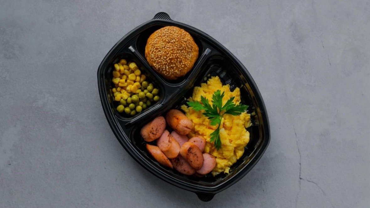 Скрэмбл,сосиски Петровские,горошек,кукуруза,пампушка